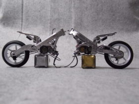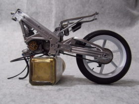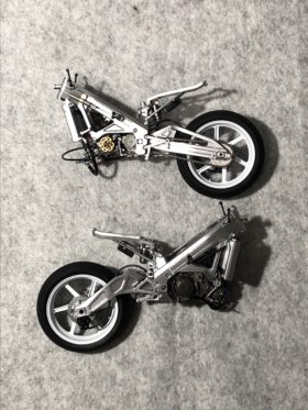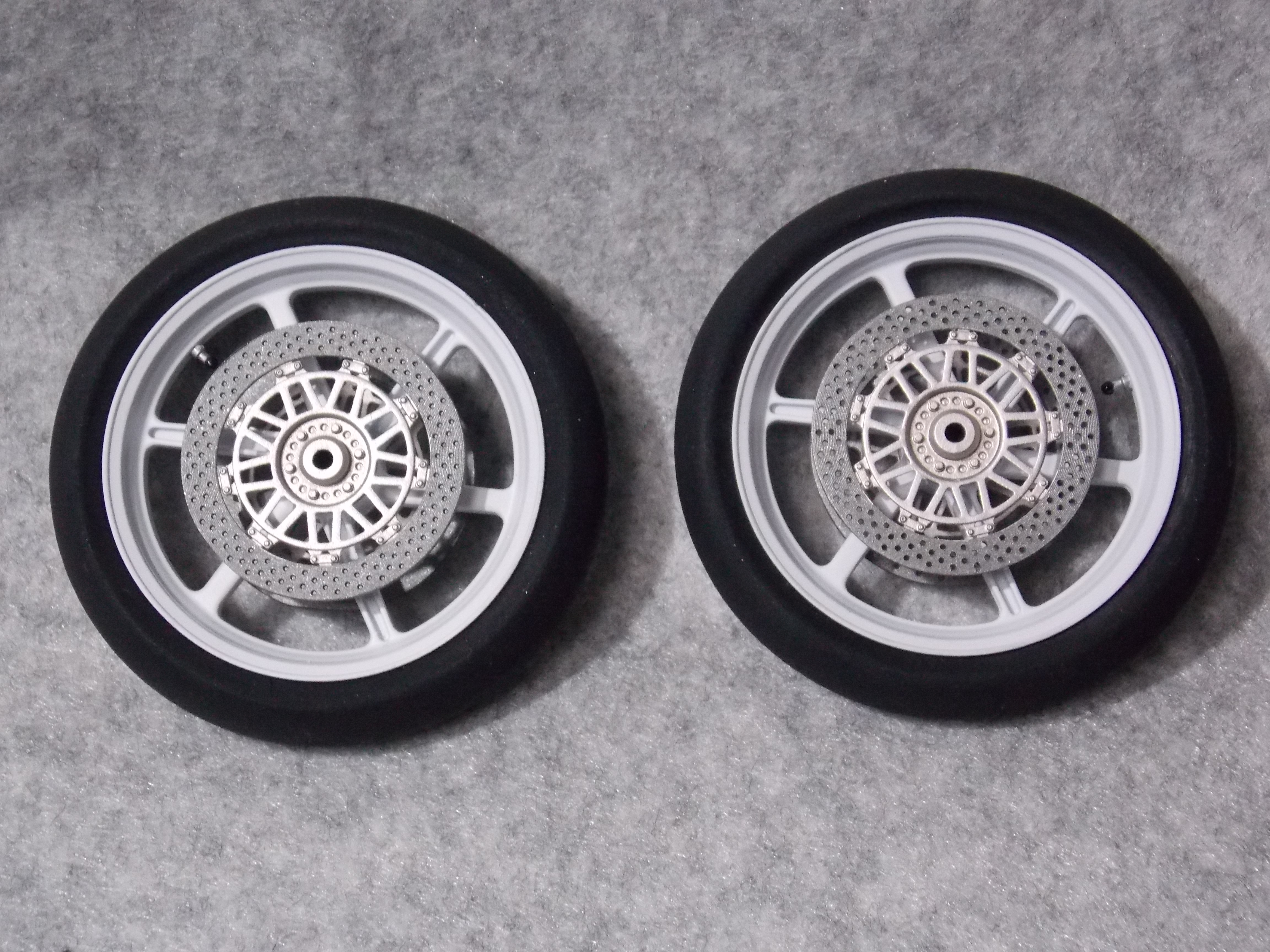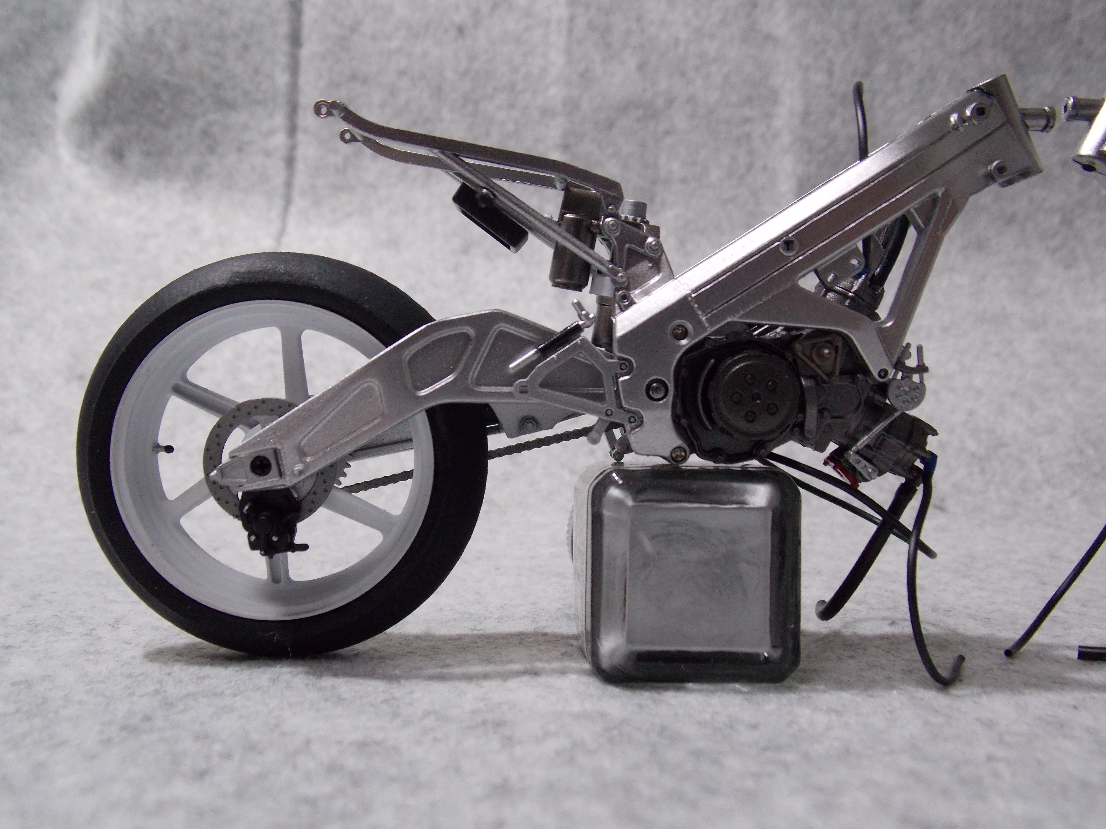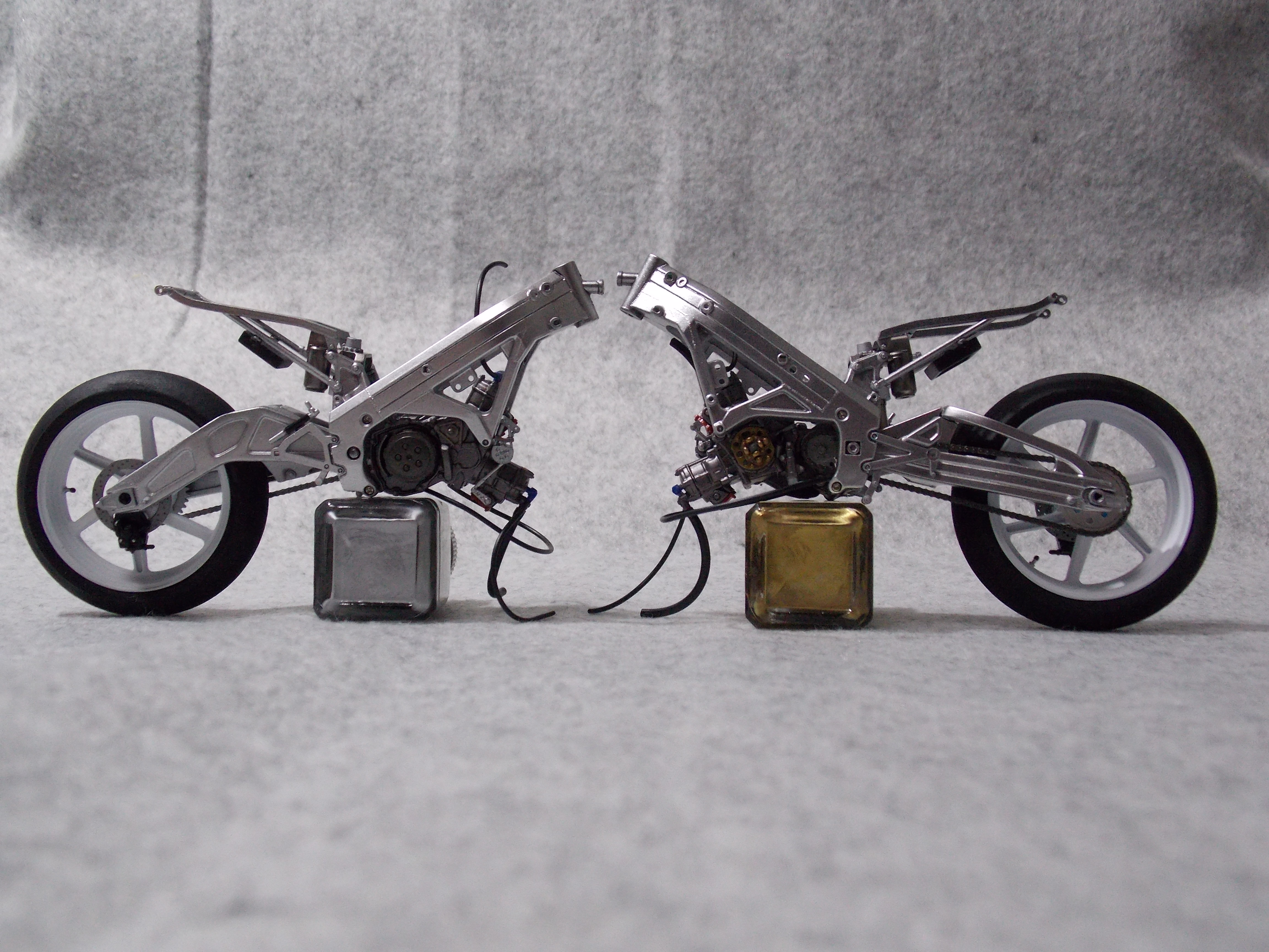 #11 1/12 CUP NOODLE HONDA NSR250(塗装&組立て編) タイヤのパーティングラインを消して、ディスクを外がメタリックグレー、内がシルバー+ゴールドで塗り分けて、ホイールと合体。 タンクとカウルのデカールを揃えるのに、位置決めがしやすいように、フレームにタンクとカウル仮止めしてからデカールを貼っていきます。 エンジンにパイピングをしてフレームに固定。 リアタイヤ、チェーンも固定。 段々とバイクらしくなってきました。 今日はここまで。