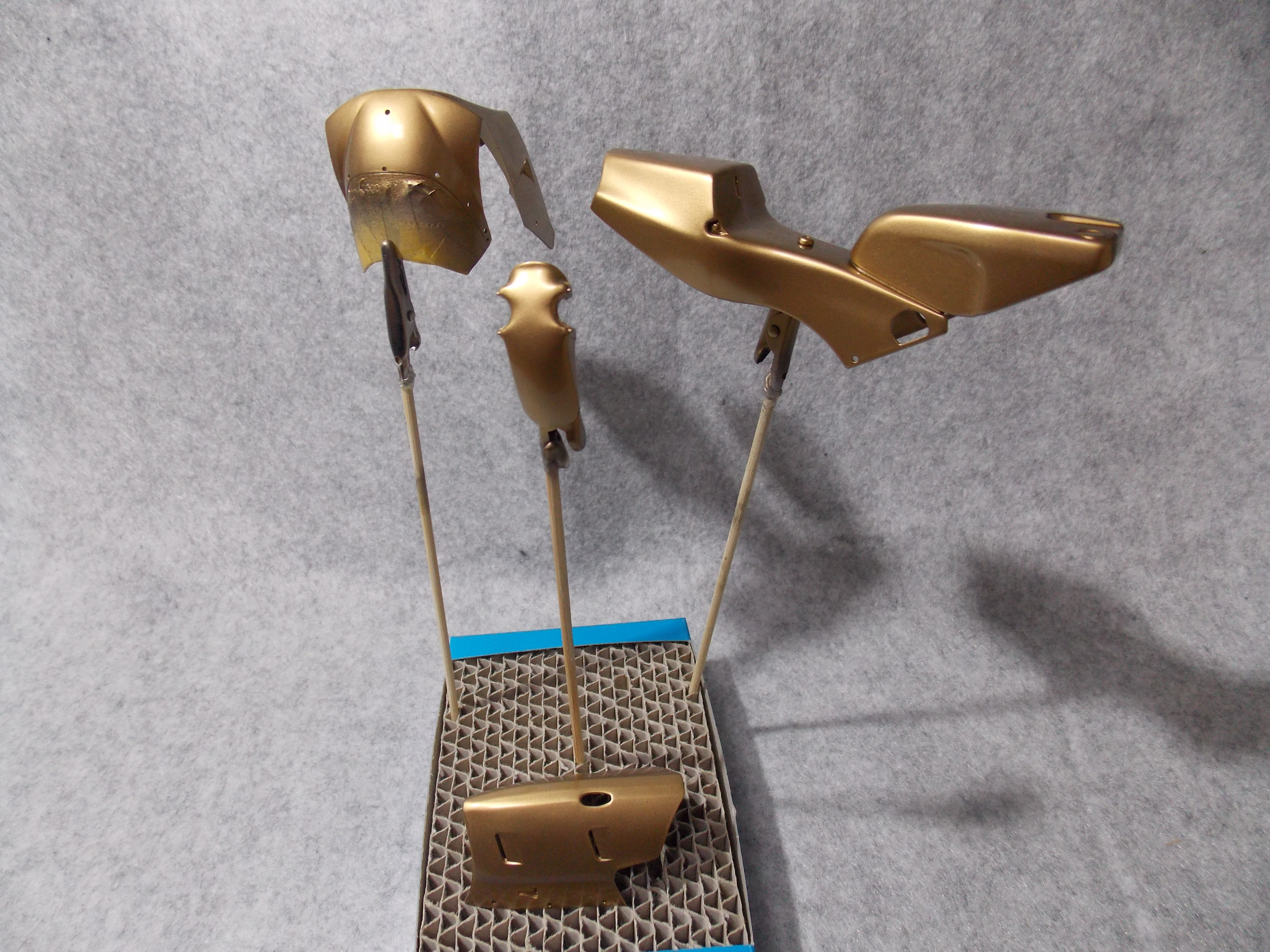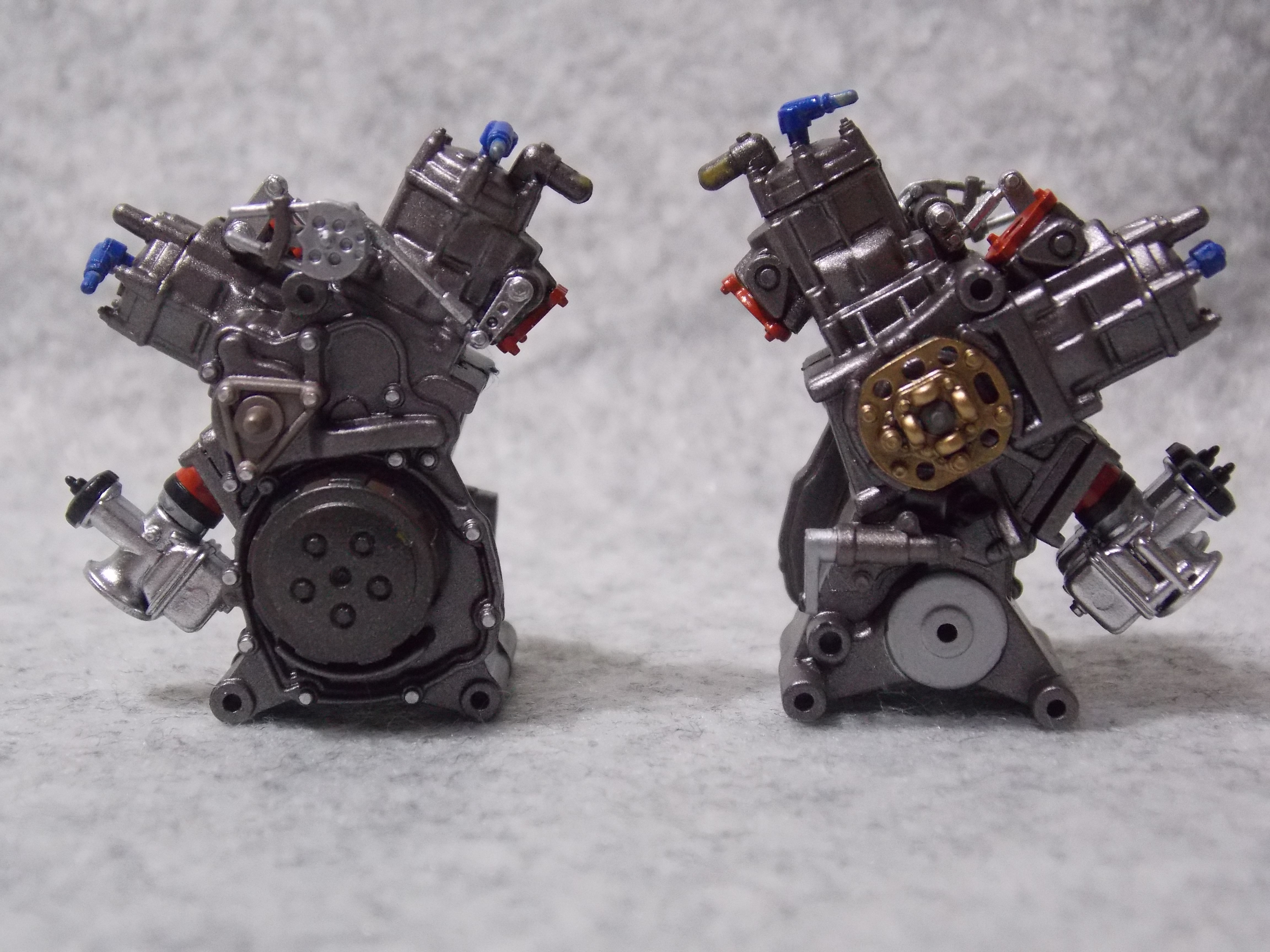 #6 1/12 CUP NOODLE HONDA NSR250(クリアー塗装&組立て編) デカールを貼る前にクリアーを塗装しました。 金の方も同様にデカールを貼る前にクリアーを塗装しました。 エンジンが完成しました。 今日はここまで。