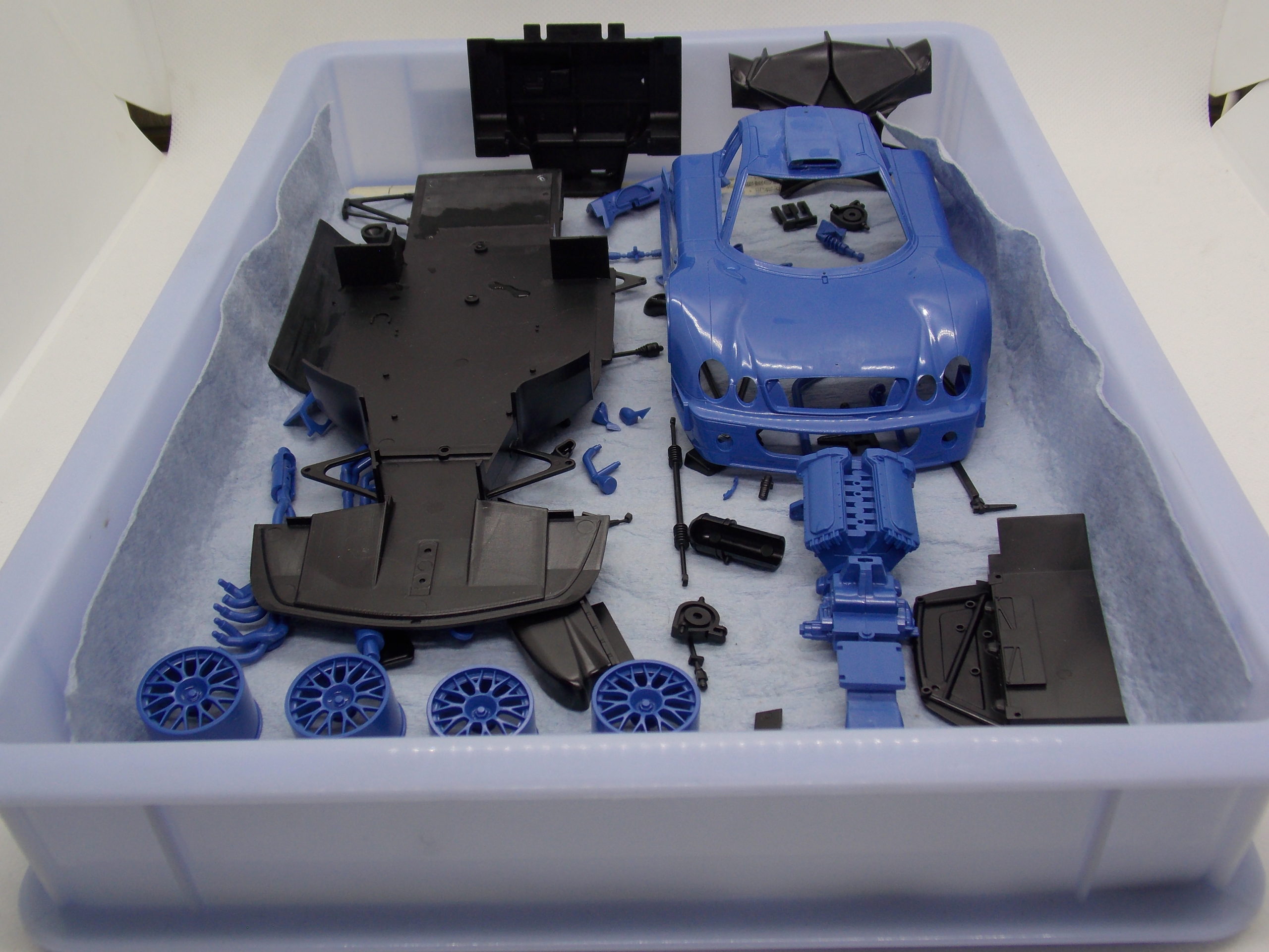 #2 1/24 Mercedes CLK-GTR Original-Teile (バリ取り&洗浄編) ゲート処理をして、超音波洗浄機で水洗い。 箱に入れて乾燥待ち。乾燥したら塗装に入ります。 今日はここまで。