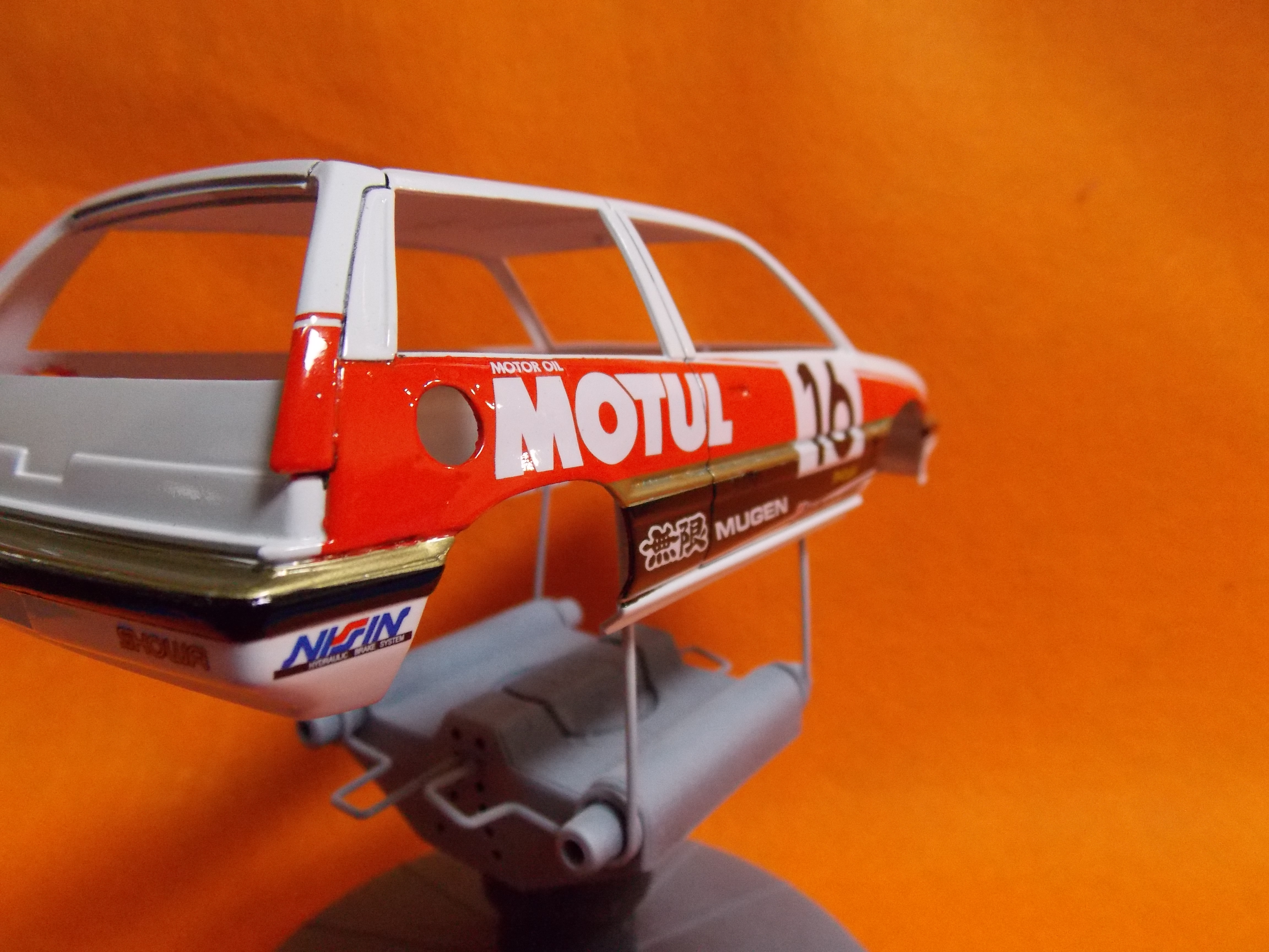 #14 1/24 HONDA MUGEN CIVIC Si Gr.A RACING(クリアー塗装編) デカール乾燥後、クリアー塗装をしました。 クリアーが乾燥後、鏡面仕上げをしました。 リアガラスも塗り分けました。 このキットには窓枠のマスキングテープが付属してなくてマスキングするのに手間がかかりました。 もうすぐ完成出来そうです。 今日はここまで。