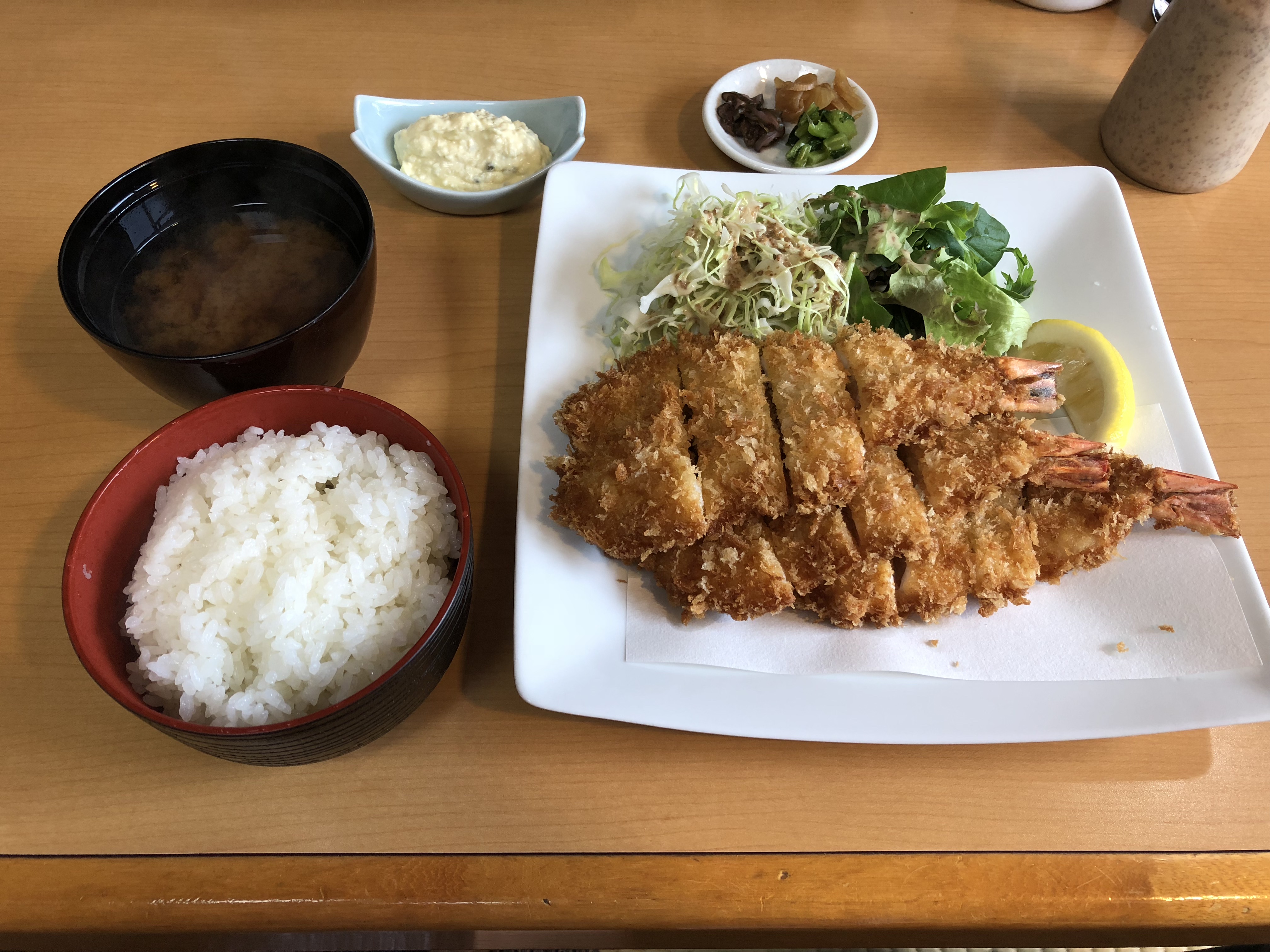 伊勢海老が3尾(大きい場合は2尾の時もある)味噌汁、御飯(おかわり自由)、香の物、タルタルソース(おかわり自由)が付いてます。