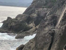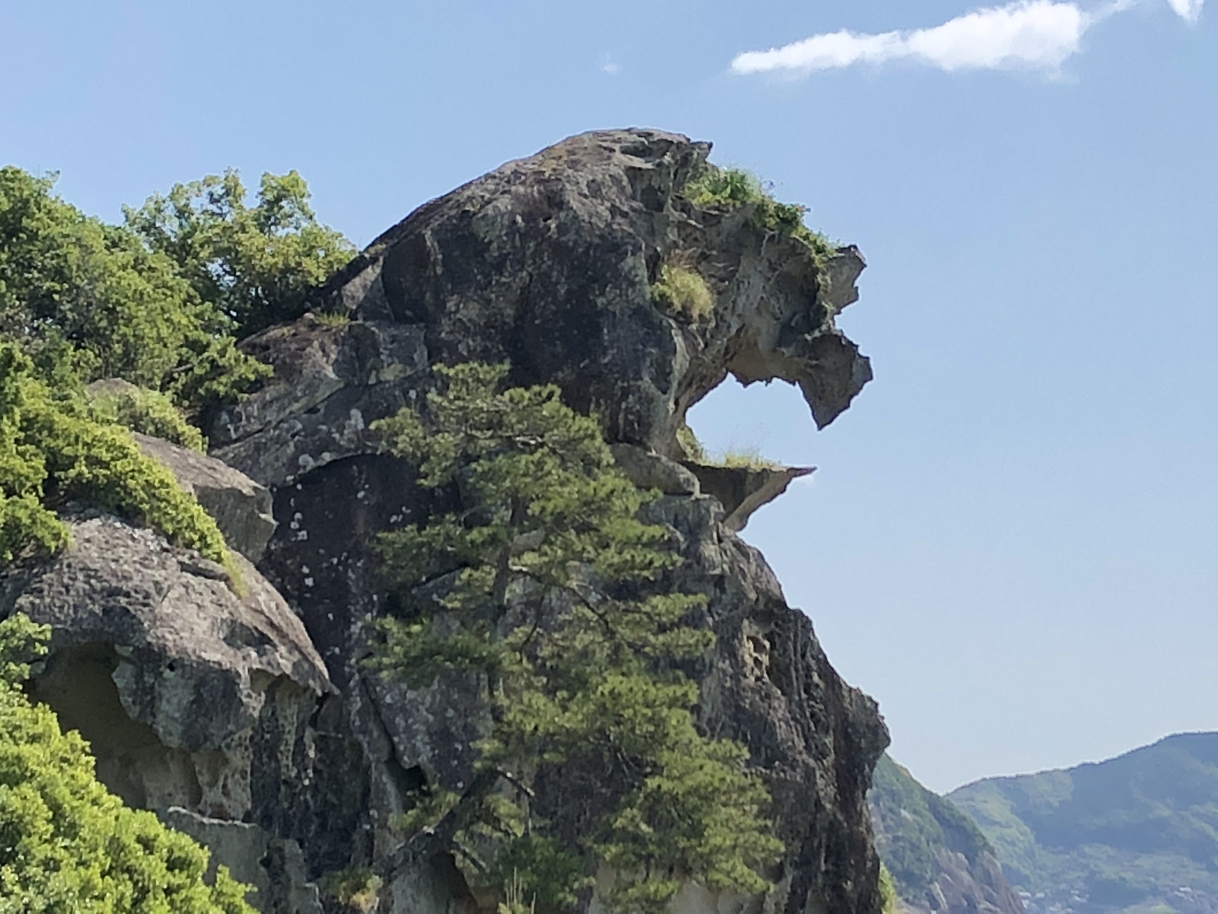 伊勢志摩から始まるリアス式海岸の南端に位置し、熊野灘の荒波と急激な地盤の隆起よって作り出された大小の海食洞が約1.2km続く凝灰岩の大岩壁だそうです。