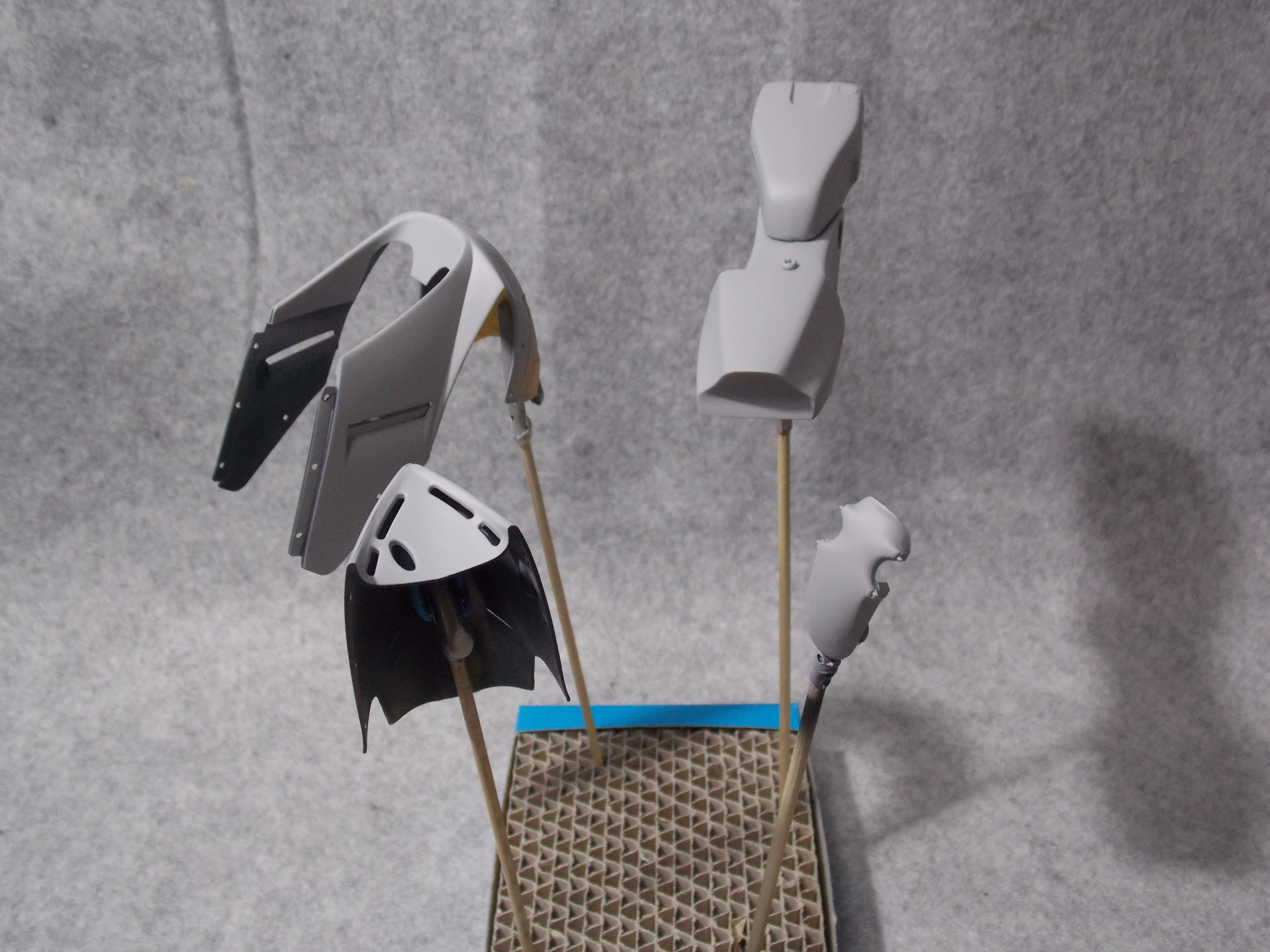 #5 1/12 CUP NOODLE HONDA NSR250(本塗装&組立て編) ボディ、カウル等にシルバーを塗装。 フィニッシャーズのファインシルバーを塗りました。 ボディ、カウル等にゴールドを塗装。 ゴールドが無かったので、フィニッシャーズの赤金を塗りました。 塗装が終わった物から組立てていきます。 一部筆塗りです。 エンジンブロックも一部筆塗りで部品を接着しました。 今日はここまで。