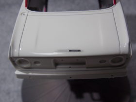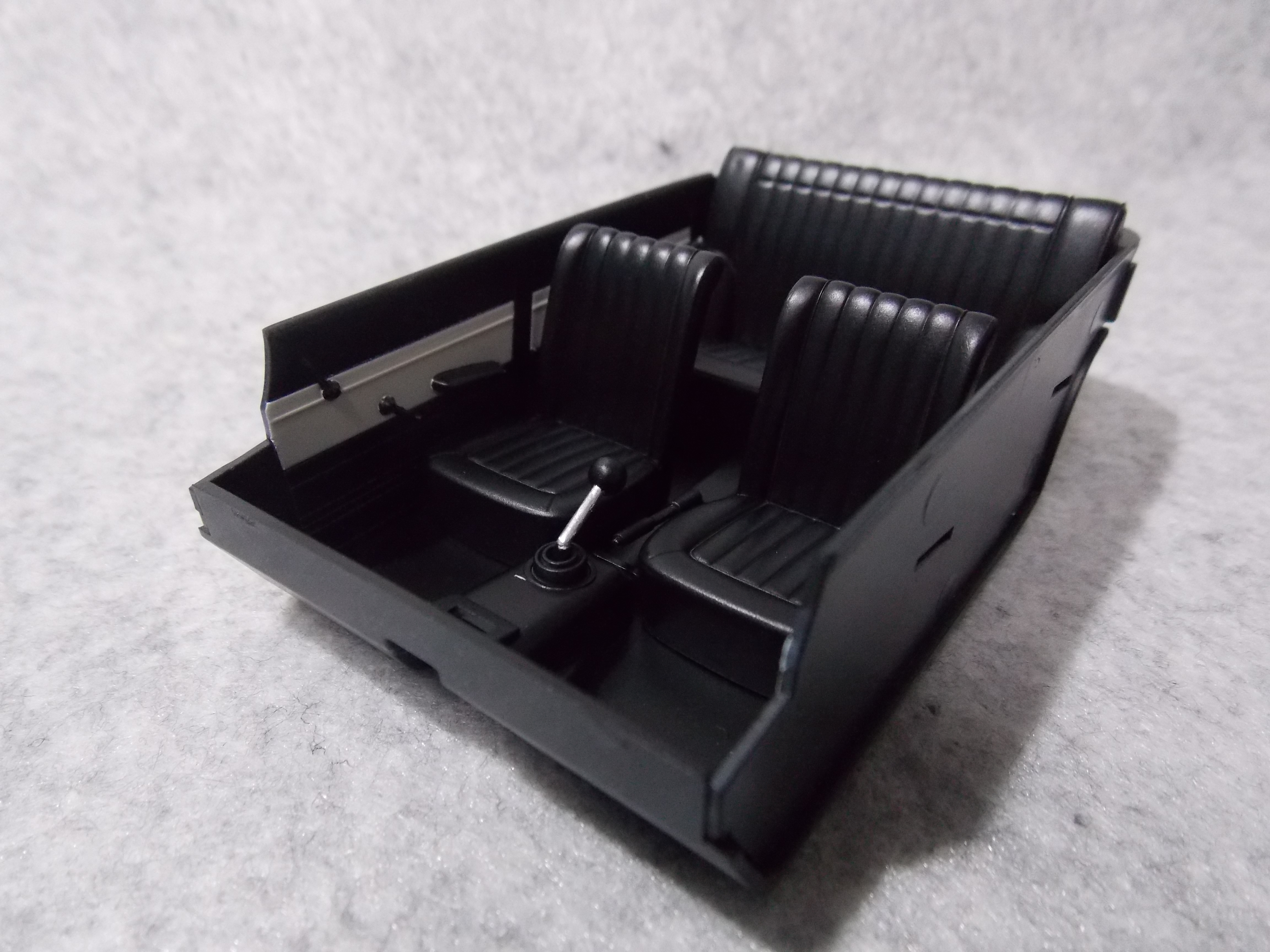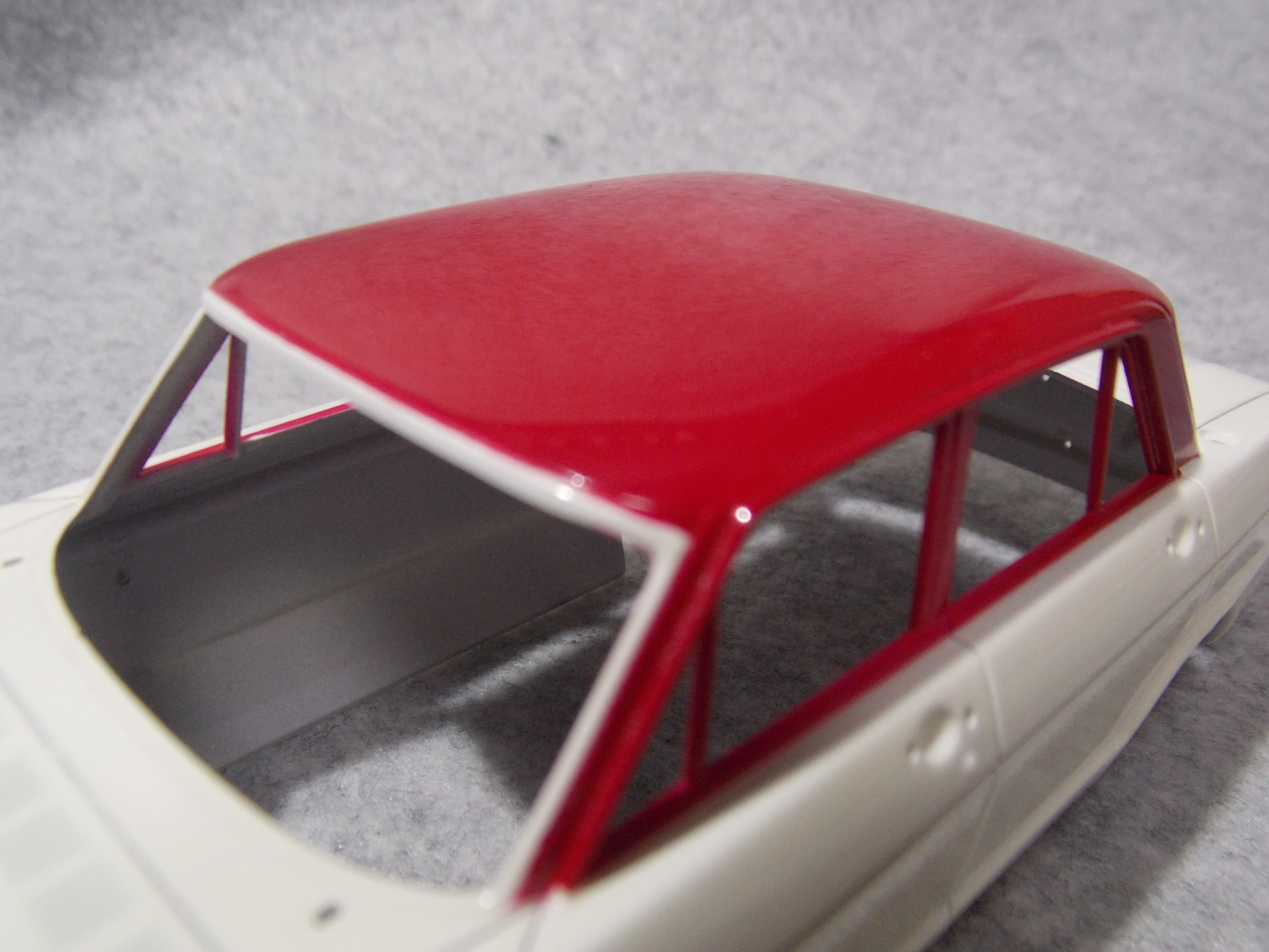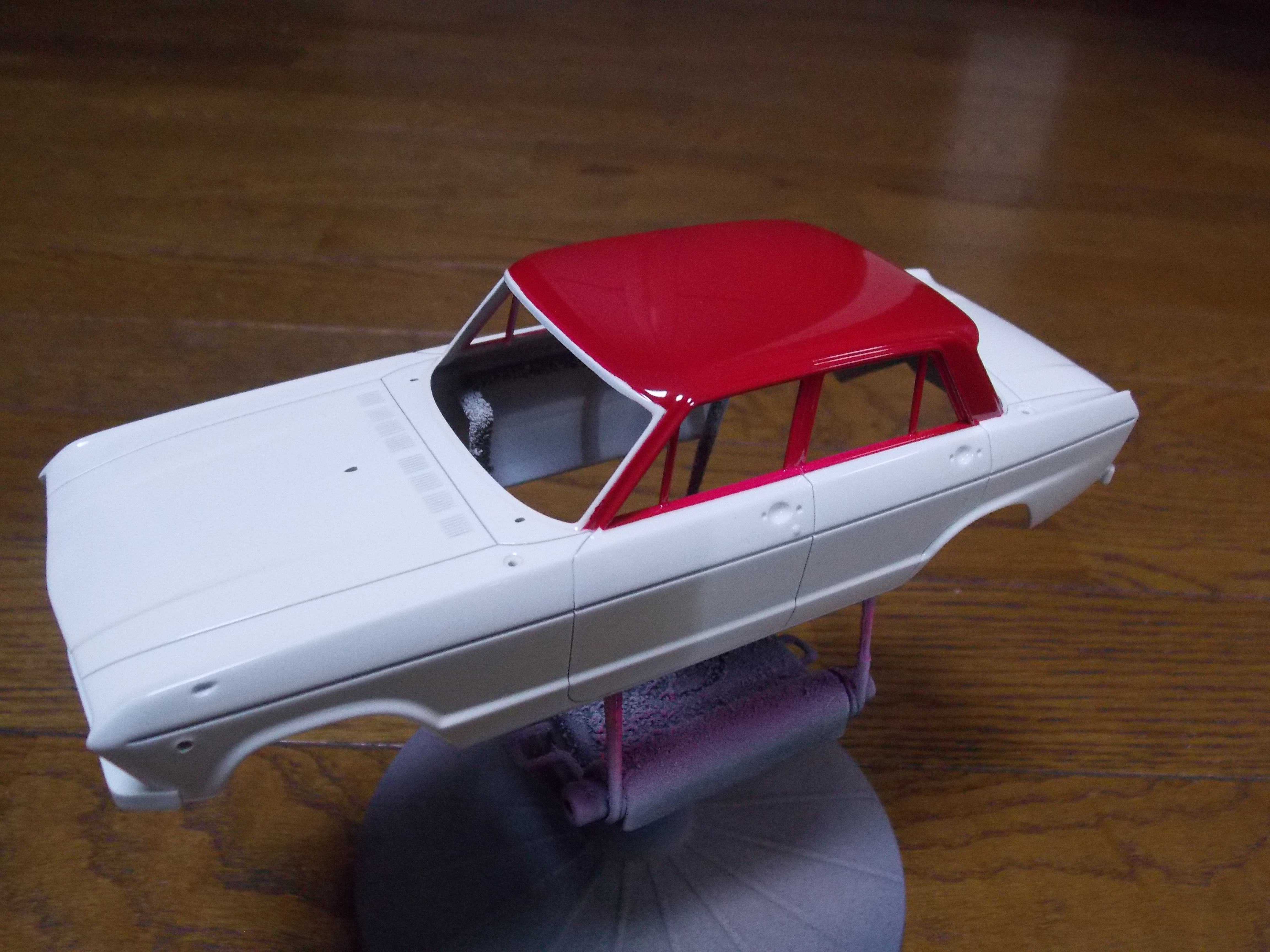 #4 1/24 SKYLINE 2000GT-B(S54B) (本塗装&組み立て編) 銀の指定のところを塗装。 ハンドルも銀に塗装後、マスキングをしてブラウンとクリアーレッドを少量混ぜて塗装。 真ん中の黒は筆塗りでセミグロスブラックで塗装。 バスタブもシート、シフトノブ、ドアの内張を接着しました。 ボディーの方は、#1500で表面を整えて、フィニッシャーズのアイボリーホワイトを塗装。 屋根を赤く塗る前にクリアーを塗装しました。 今日はここまで。
