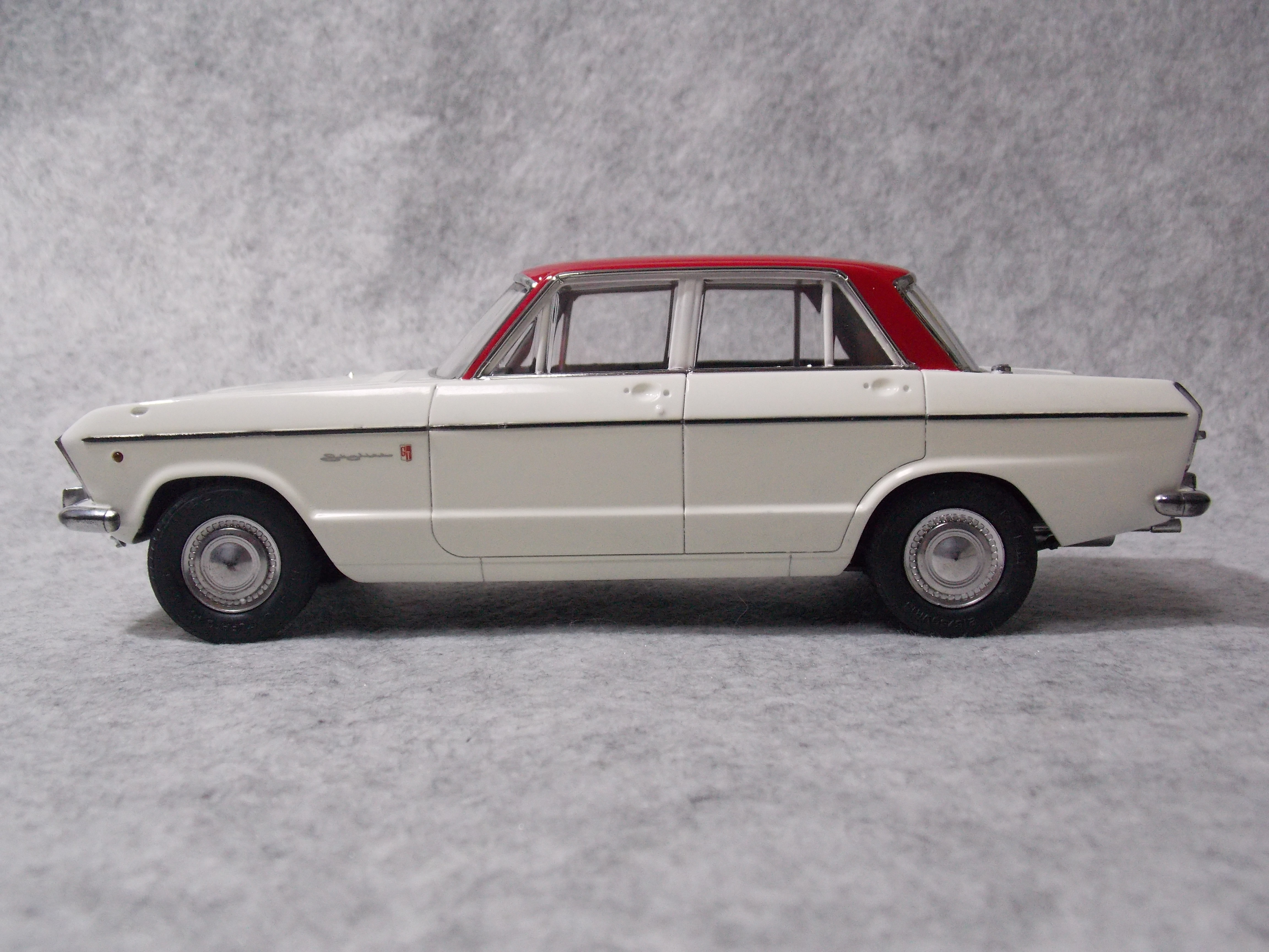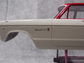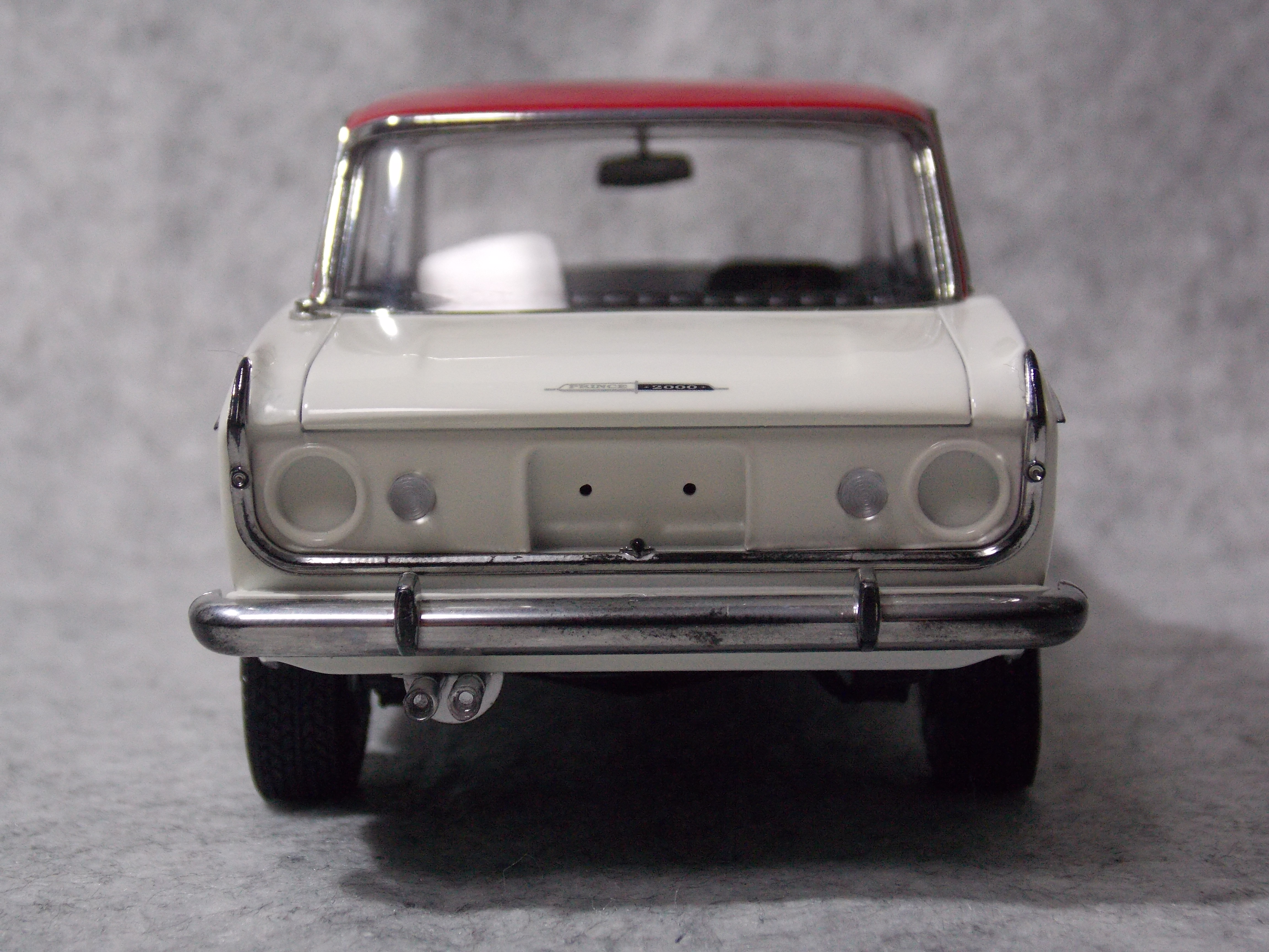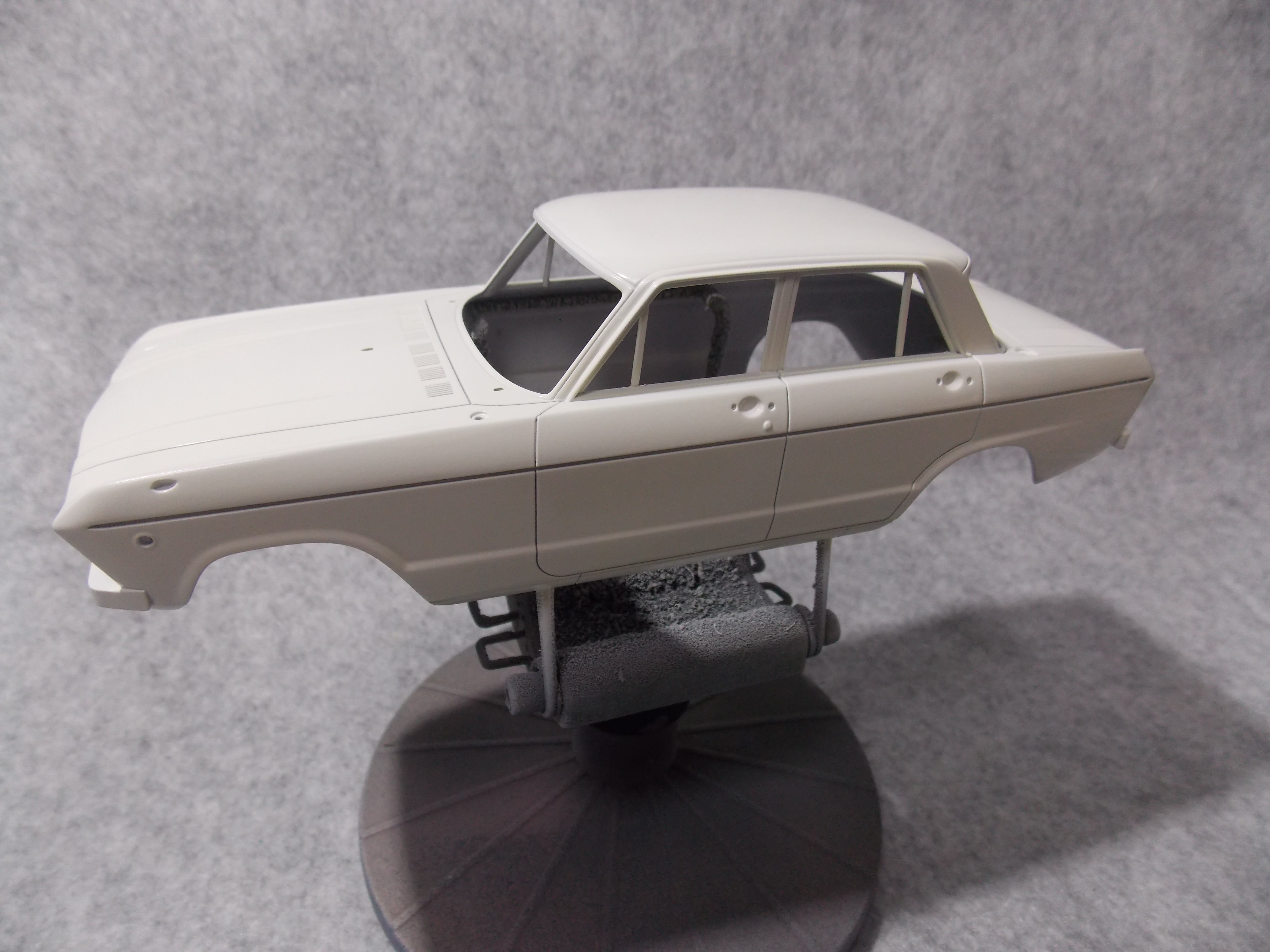 #4 1/24 SKYLINE 2000GT-B(S54B) (本塗装&組み立て編) 銀の指定のところを塗装。 ハンドルも銀に塗装後、マスキングをしてブラウンとクリアーレッドを少量混ぜて塗装。 真ん中の黒は筆塗りでセミグロスブラックで塗装。 バスタブもシート、シフトノブ、ドアの内張を接着しました。 ボディーの方は、#1500で表面を整えて、フィニッシャーズのアイボリーホワイトを塗装。 屋根を赤く塗る前にクリアーを塗装しました。 今日はここまで。
