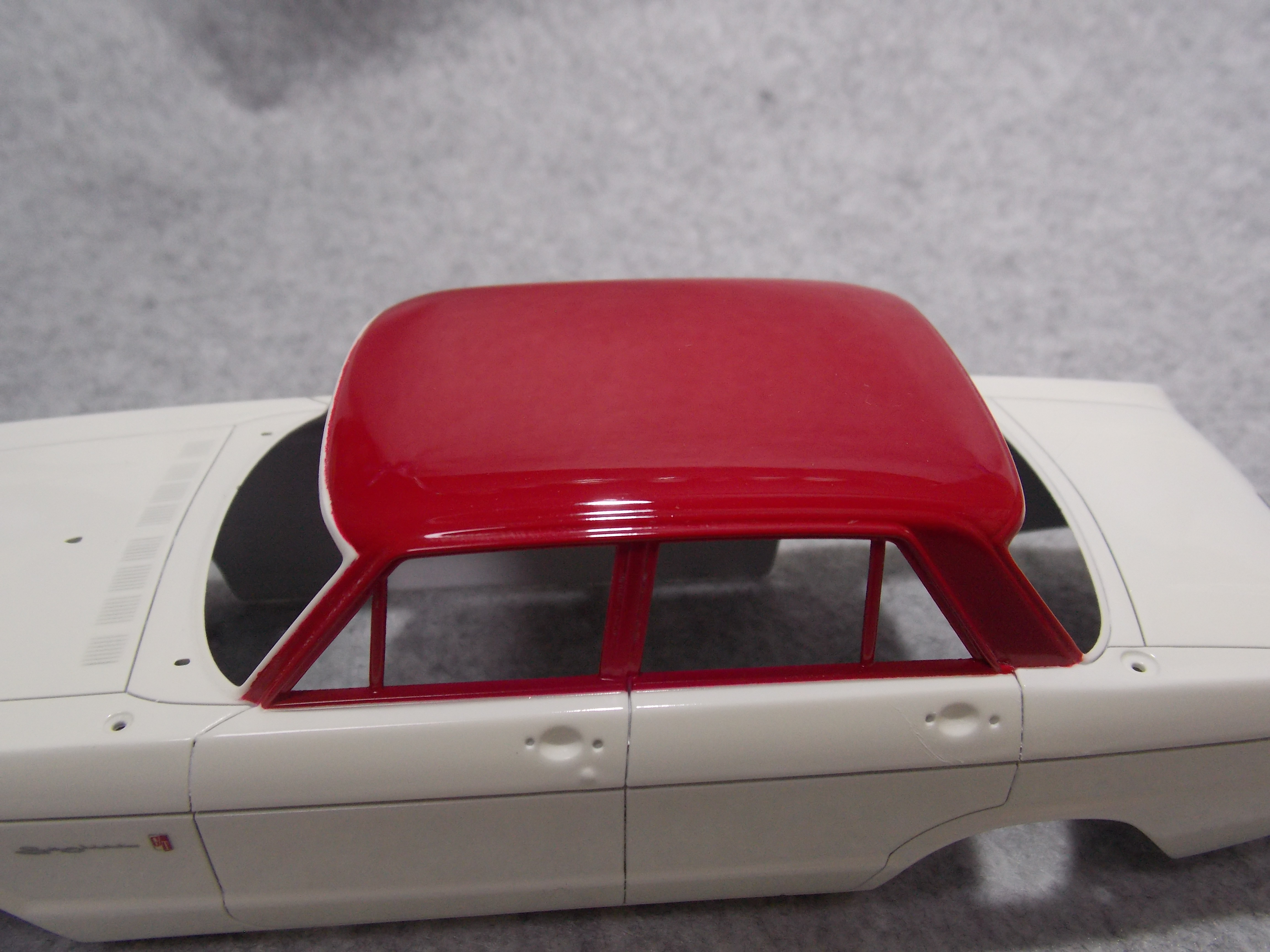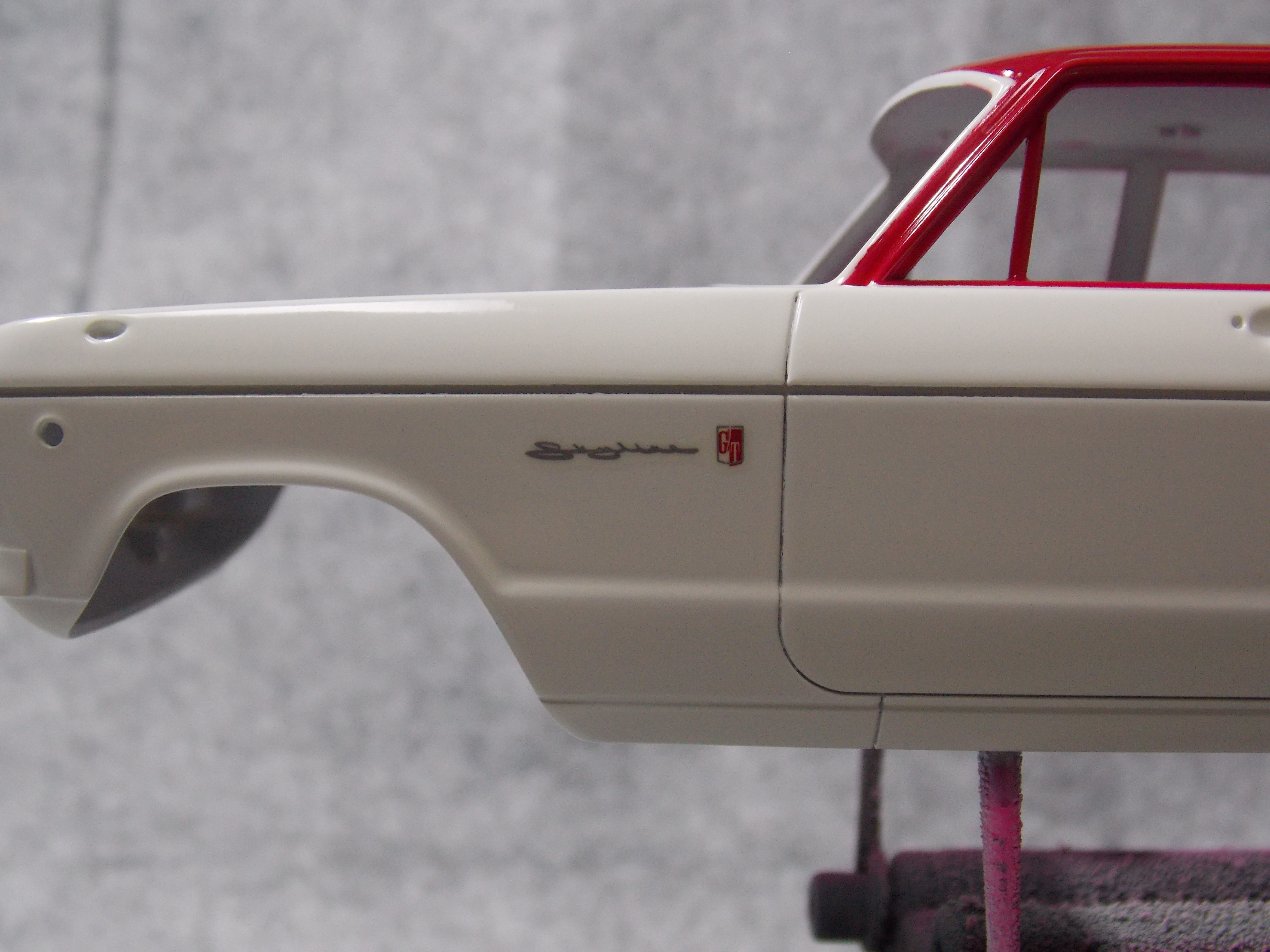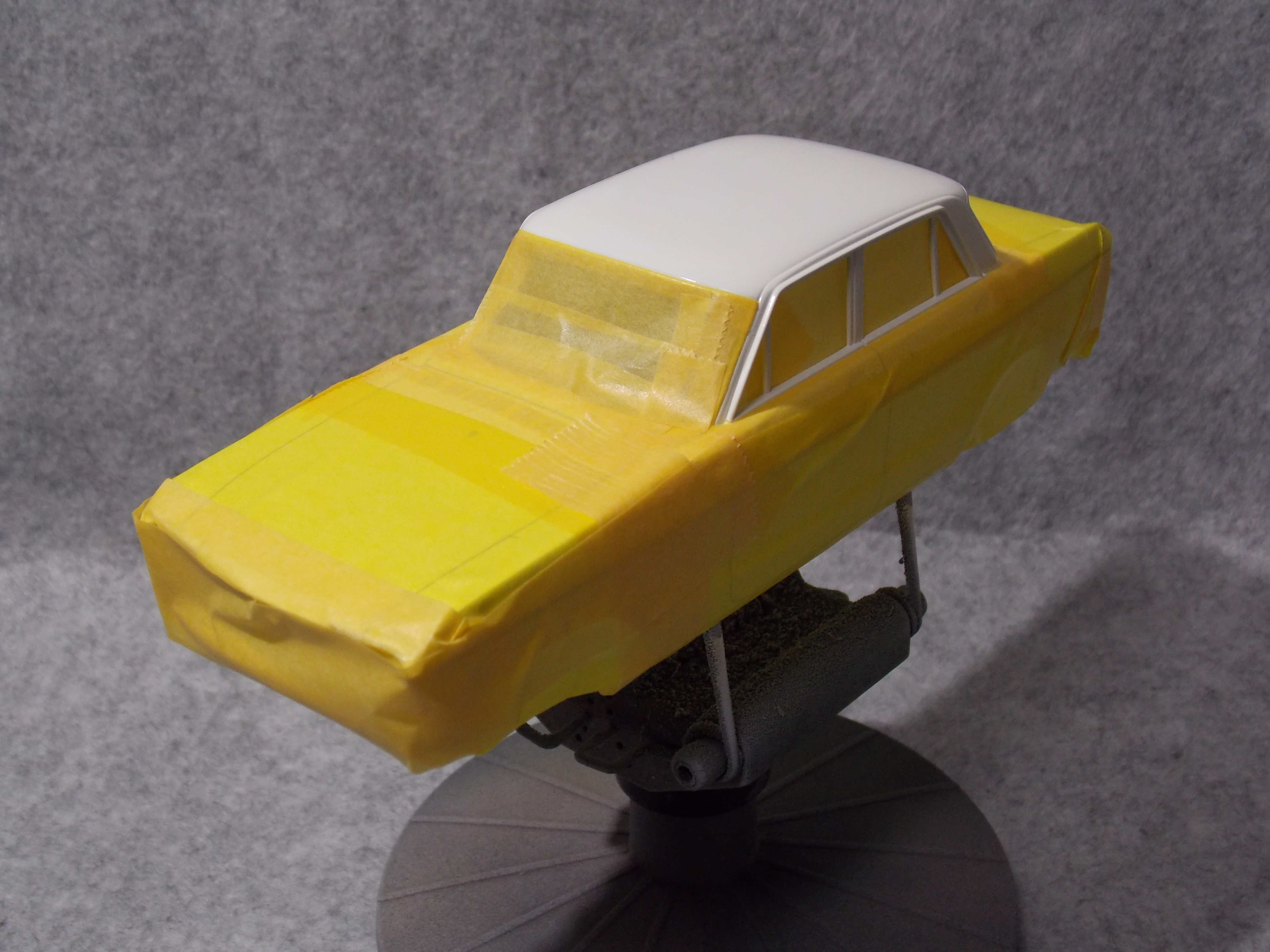 #5 1/24 SKYLINE 2000GT-B(S54B) (塗分け本塗装編) 屋根部とピラー部を塗り分ける為にマスキングをしました。 塗料が漏れないようにグルグル巻きです。 頑張って漏れない様にマスキングをしたが一部漏れていました。 塗った色はフィニッシャーズのマルーンです。 今日はここまで。