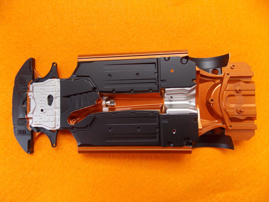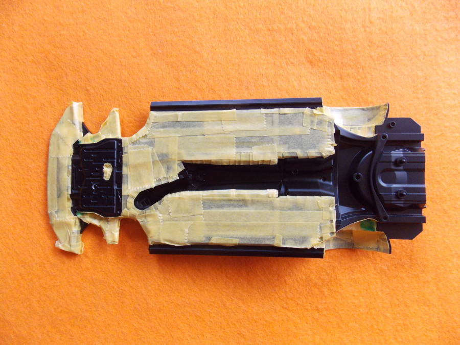#8 TOYOTA86(塗装編) シャーシにセミグロスブラックを塗装後、塗り分ける部分にマスキングをした所。 結構面倒でした。 TS-92(メタリックオレンジ)をスプレーからビンに移して、エアーブラシで塗装。 シルバー部分はMR.COLORのスーパーチタンで塗装。 こちらも上記と同じ色で塗り分けました。 今日はここまで。