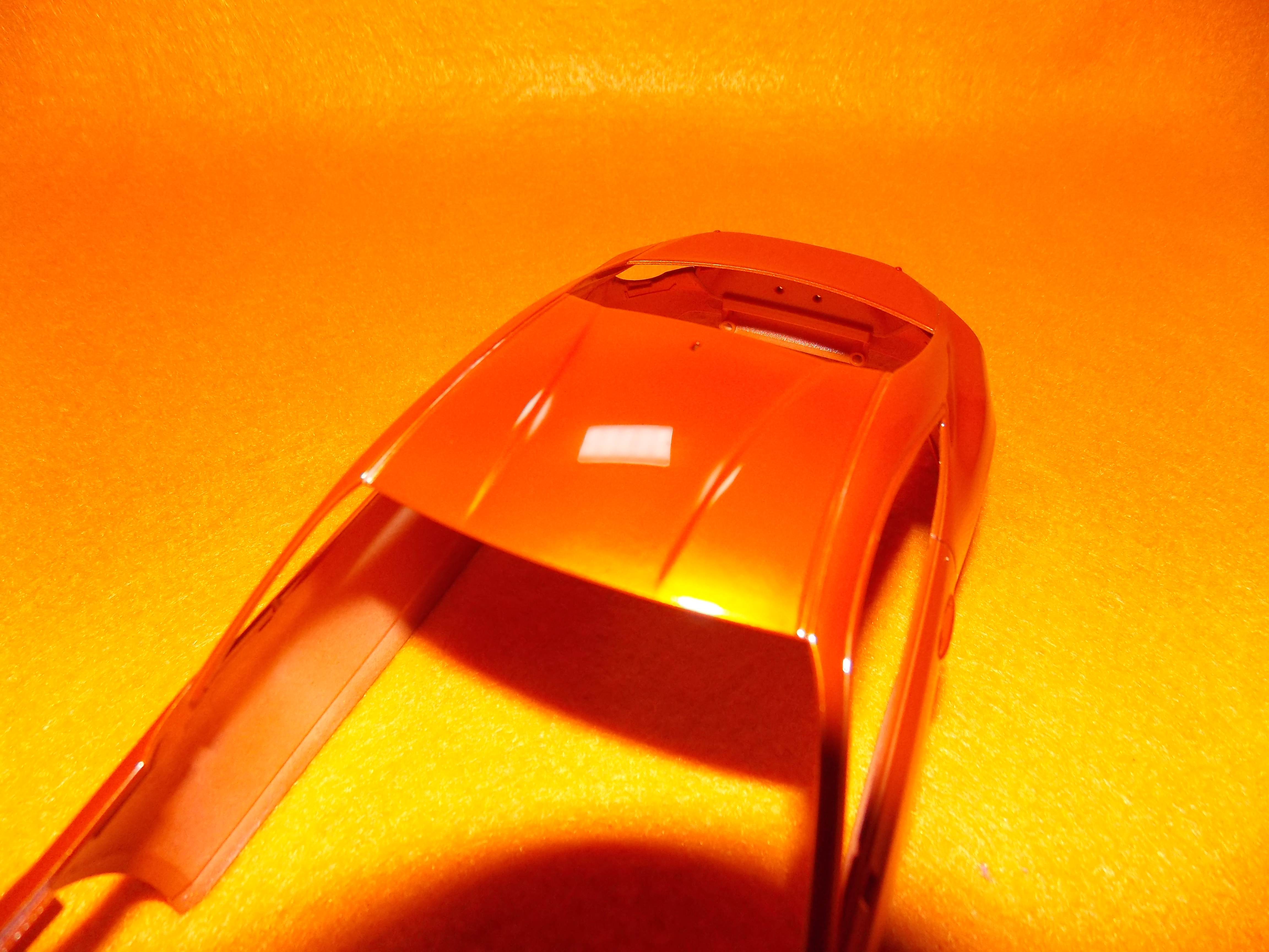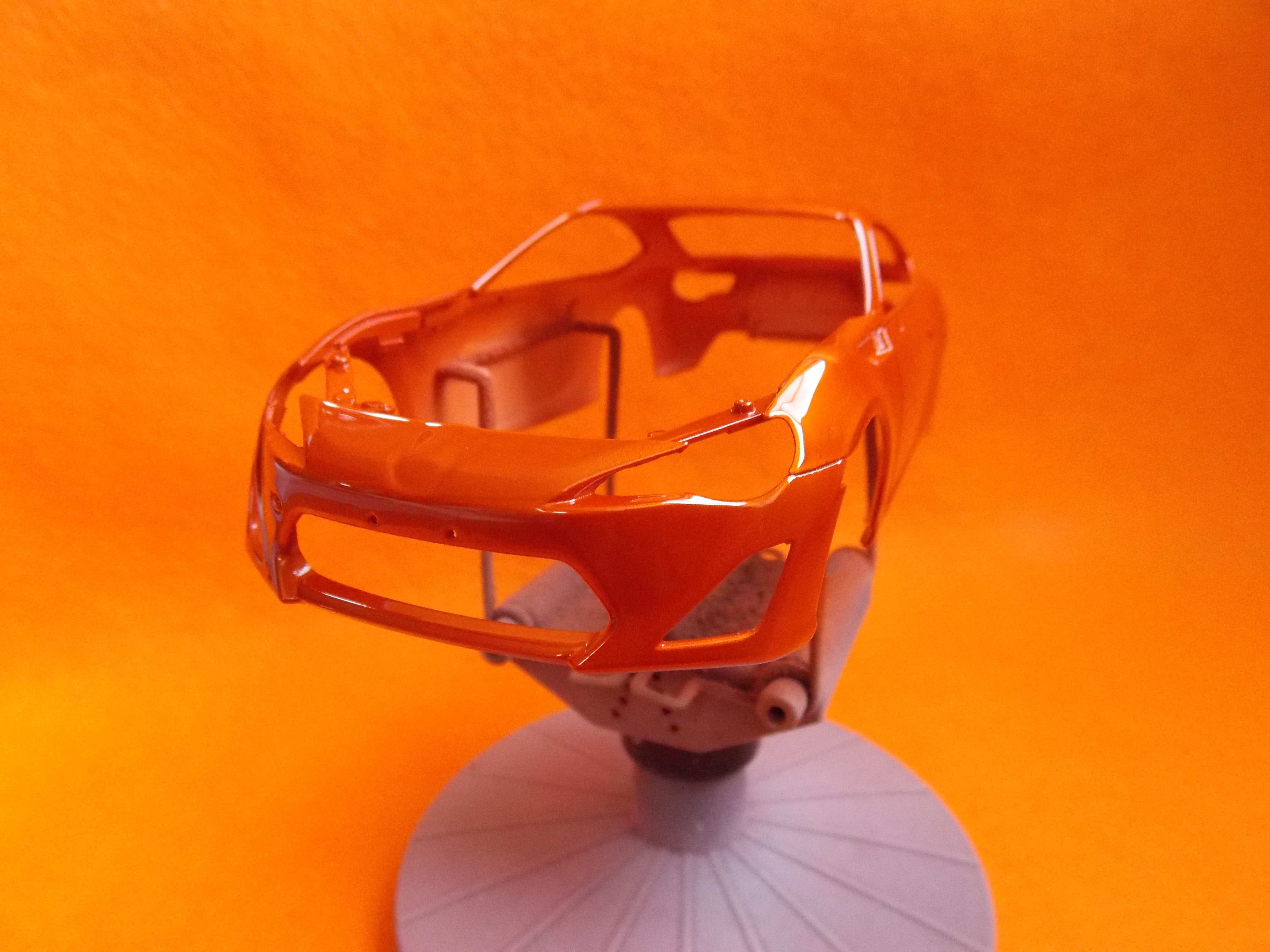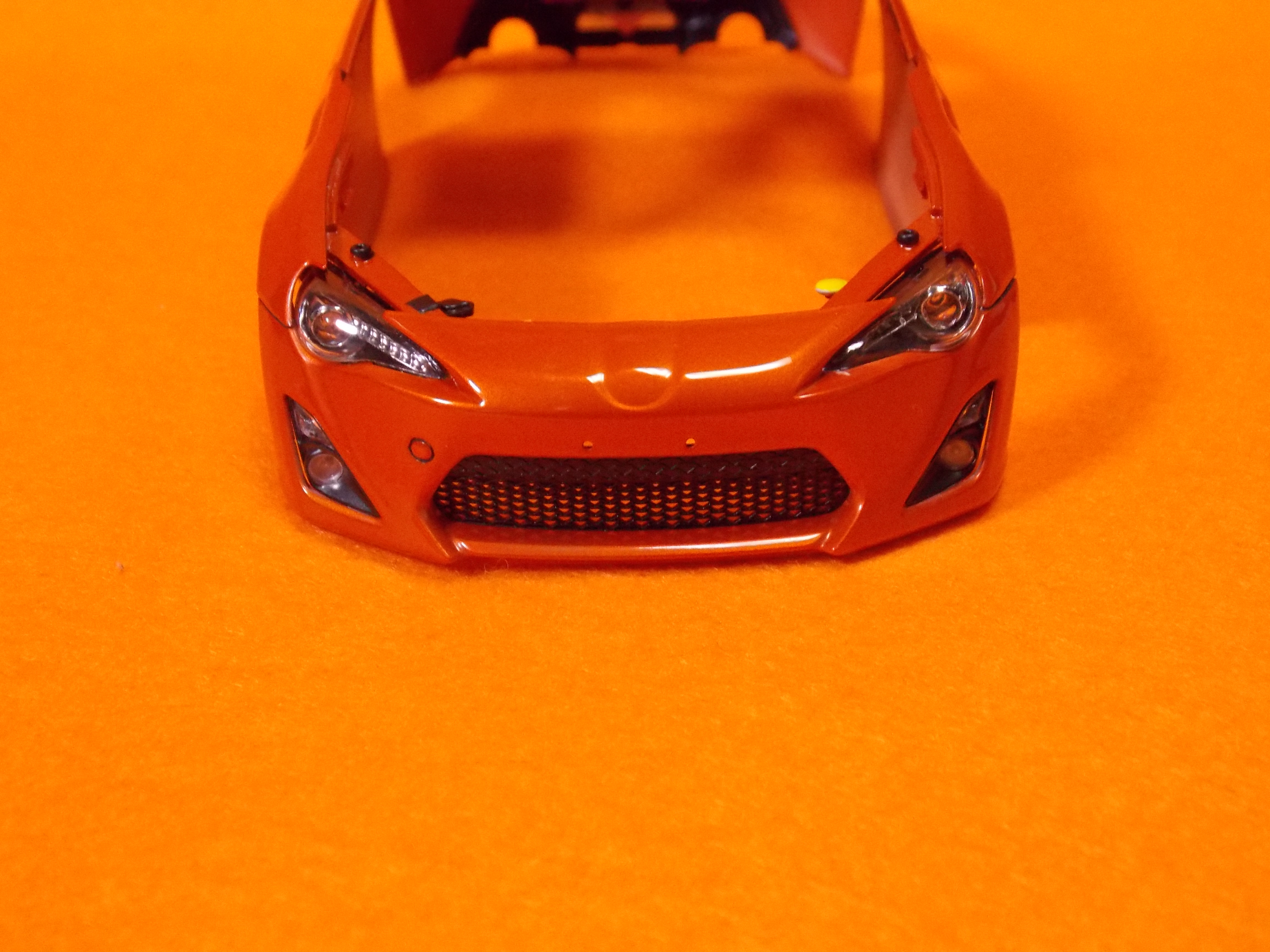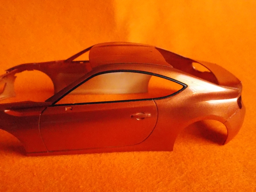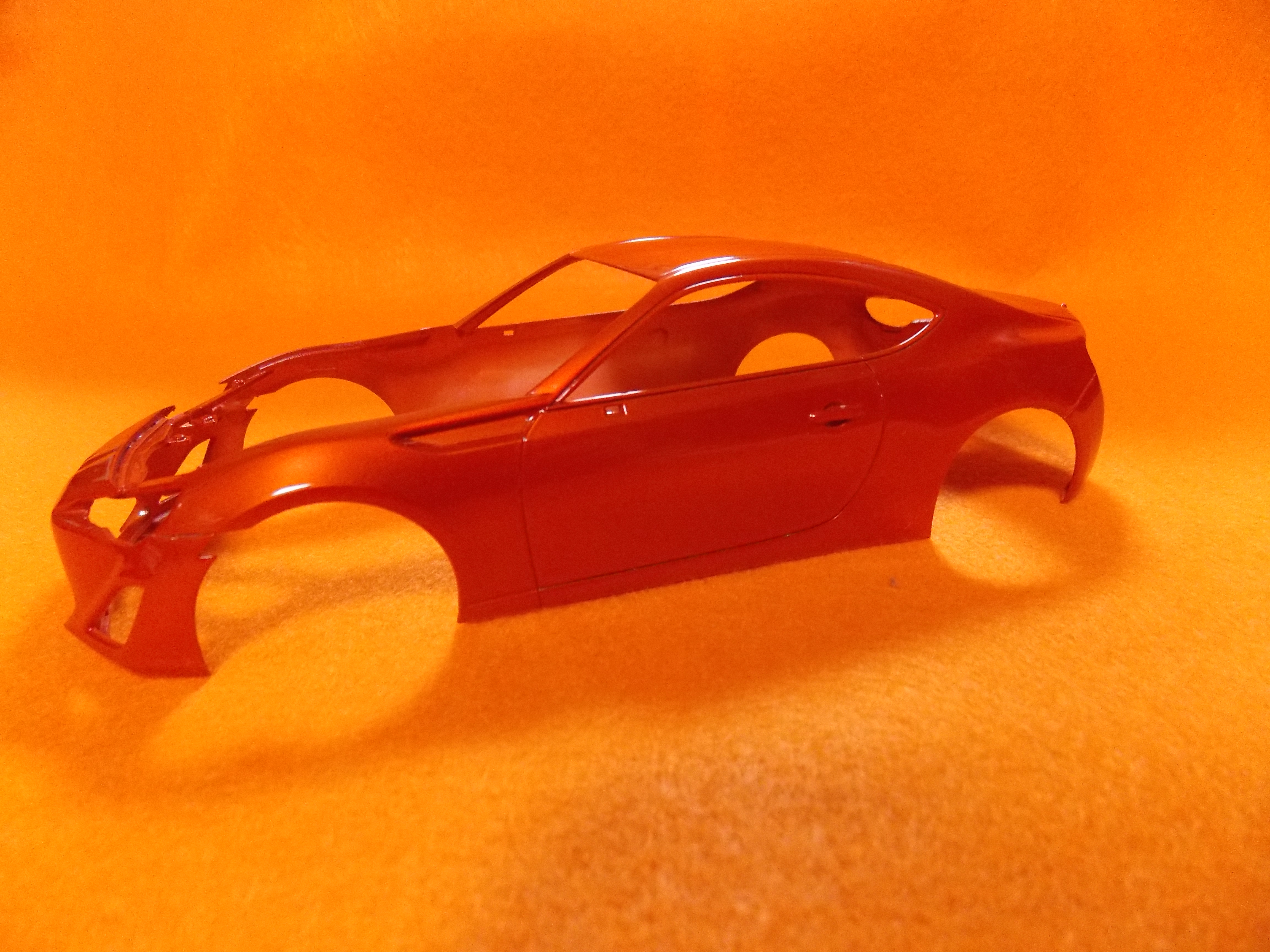 #12 TOYOTA86(塗装編) TS-92(メタリックオレンジ)を塗装しました。 計3回に分けて塗りました。 こちらのパーツもTS-92(メタリックオレンジ)を塗装しました。 フロントガラスとリアガラスも付属のマスキングテープを貼ってセミグロスブラックを塗装しました。 次回はクリアー塗装と小物類の塗装をします。 今日はここまで。