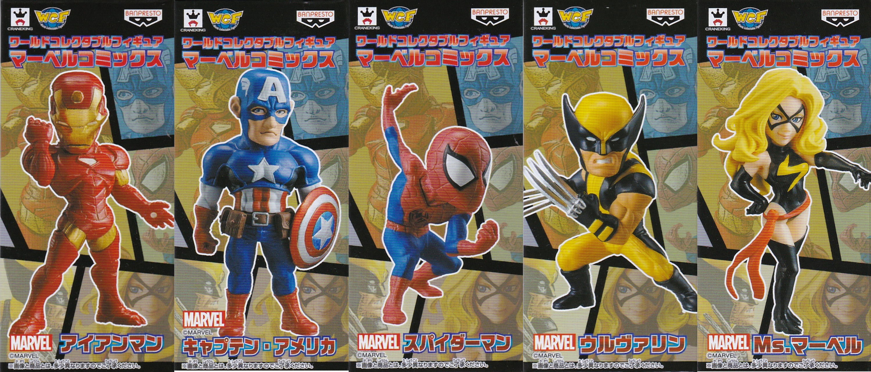 WCF マーベルコミック 全5種 発売元 : バンプレスト 名前 : アイアンマン 前面 後面 左横 右横 発売元 : バンプレスト 名前 : キャプテン・アメリカ 前面 後面 左横 右横 発売元 : バンプレスト 名前 : スパイダーマン 前面 後面 左横 右横 発売元 : バンプレスト 名前 : ウルヴァリン 前面 後面 左横 右横 発売元 : バンプレスト 名前 : Ms.マーベル 前面 後面 左横 右横