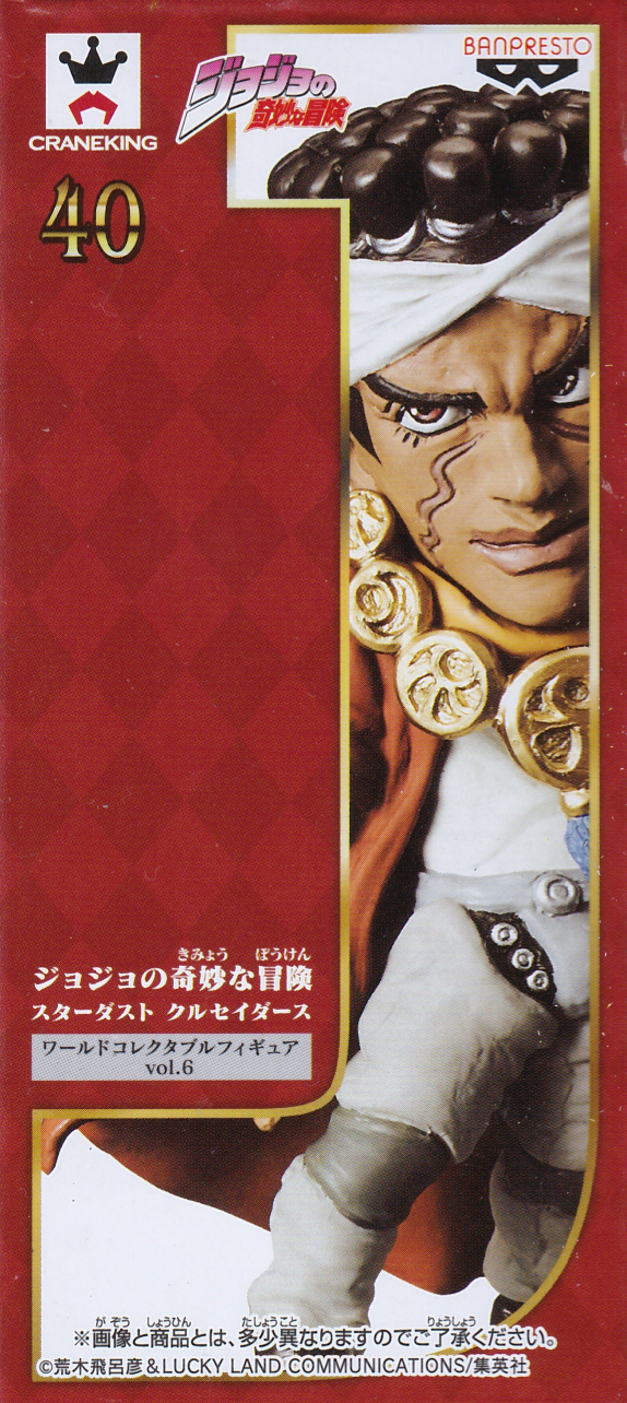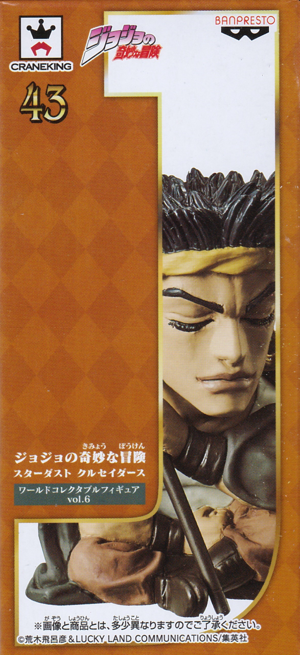 ジョジョの奇妙な冒険 スターダスト クルセイダース WCF VOL.6 全6種 発売元 : バンプレスト 名前 : 空条承太郎 番号 : 38 前面 後面 左横 右横 発売元 : バンプレスト 名前 : ジョセフ・ジョースター 番号 : 39 前面 後面 左横 右横 発売元 : バンプレスト 名前 : モハメド・アヴドゥル 番号 : 40 前面 後面 左横 右横 発売元 : バンプレスト 名前 : ホル・ホース 番号 : 41 前面 後面 左横 右横 発売元 : バンプレスト 名前 : オインゴとボインゴ 番号 : 42 前面 後面 左横 右横 発売元 : バンプレスト 名前 : ンドゥール 番号 : 43 前面 後面 左横 右横