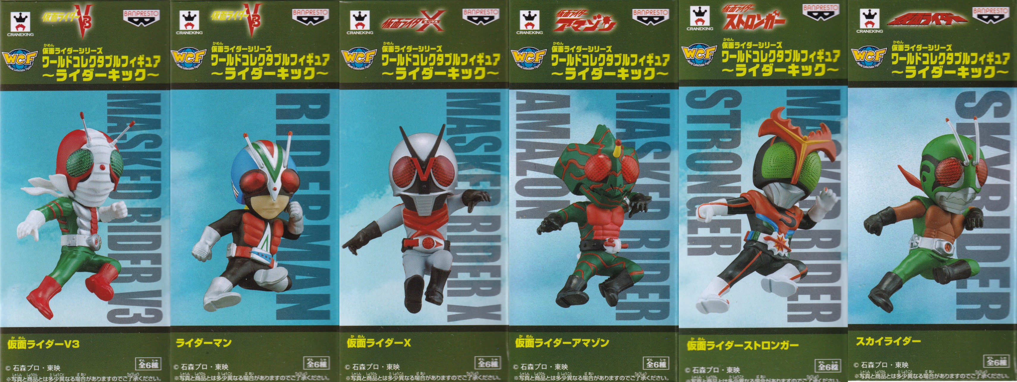 仮面ライダーシリーズ WCF ~ライダーキック~ 全6種 発売元 : バンプレスト 名前 : 仮面ライダーV3 シリーズ: 仮面ライダーV3 前面 後面 左横 右横 発売元 : バンプレスト 名前 : ライダーマン シリーズ: 仮面ライダーV3 前面 後面 左横 右横 発売元 : バンプレスト 名前 : 仮面ライダーX シリーズ: 仮面ライダーX 前面 後面 左横 右横 発売元 : バンプレスト 名前 : 仮面ライダーアマゾン シリーズ: 仮面ライダーアマゾン 前面 後面 左横 右横 発売元 : バンプレスト 名前 : 仮面ライダーストロンガー シリーズ: 仮面ライダーストロンガー 前面 後面 左横 右横 発売元 : バンプレスト 名前 : スカイライダー シリーズ: 仮面ライダー 前面 後面 左横 右横