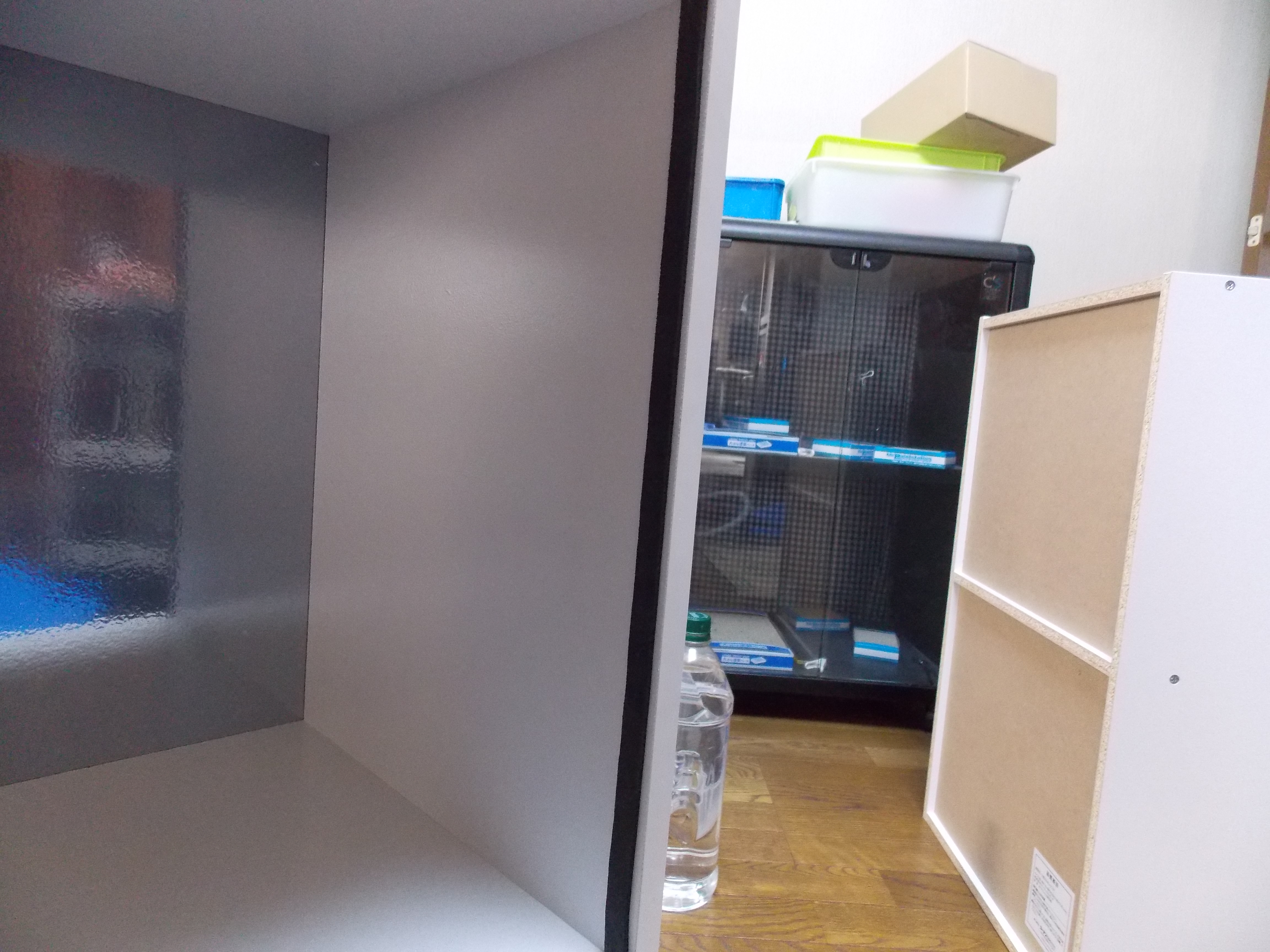 DSCN0448 DSCN0446 DSCN0449標準の背板は真っ白だたので、背面ミラー風に100円均一で買ってきた窓ガラス用シートを貼ってみました。