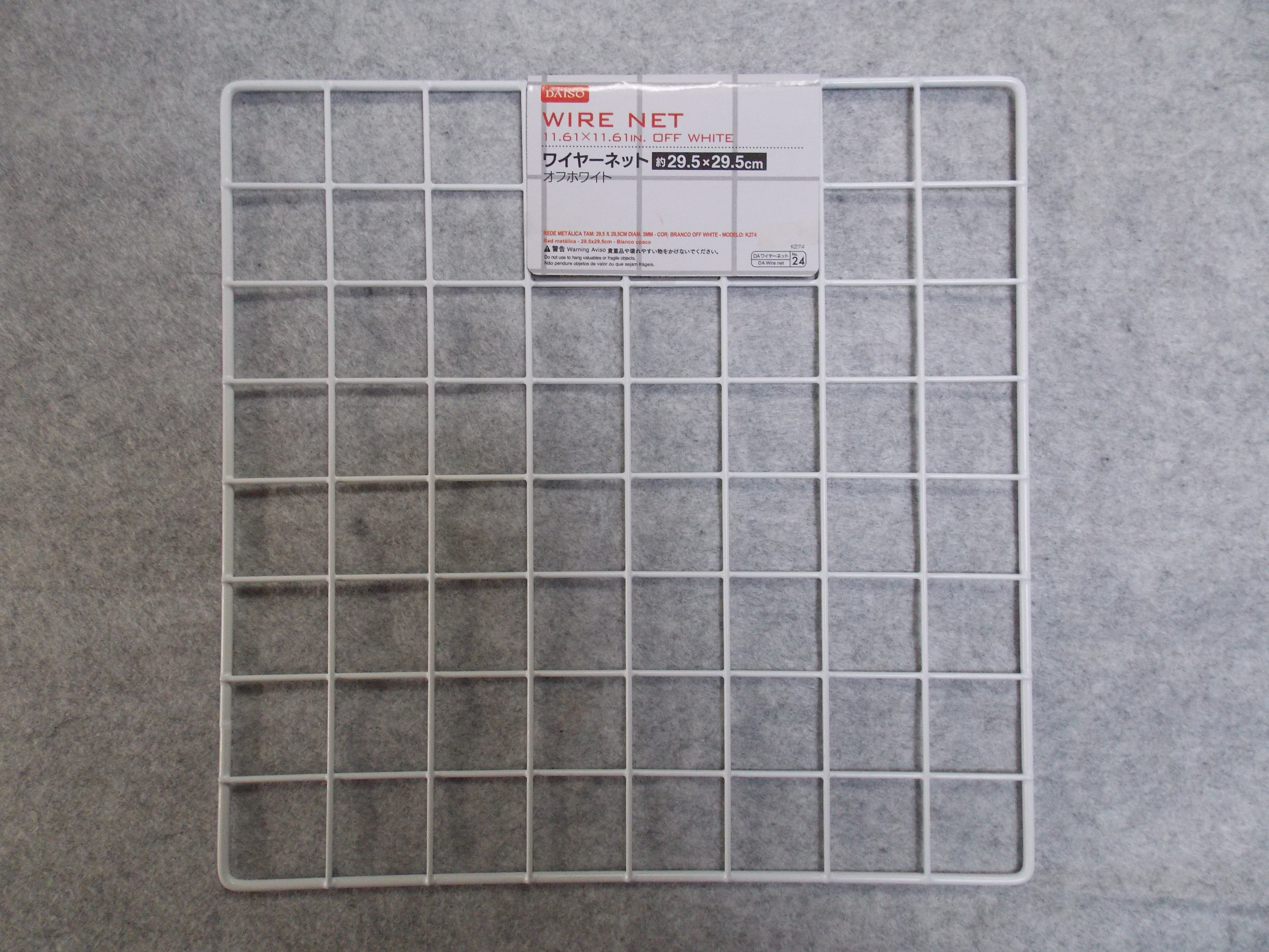説明書どうりキャビネットを組み立て、ダイソーのワイヤーネットの29.5×29.5を結束バンドで固定します。