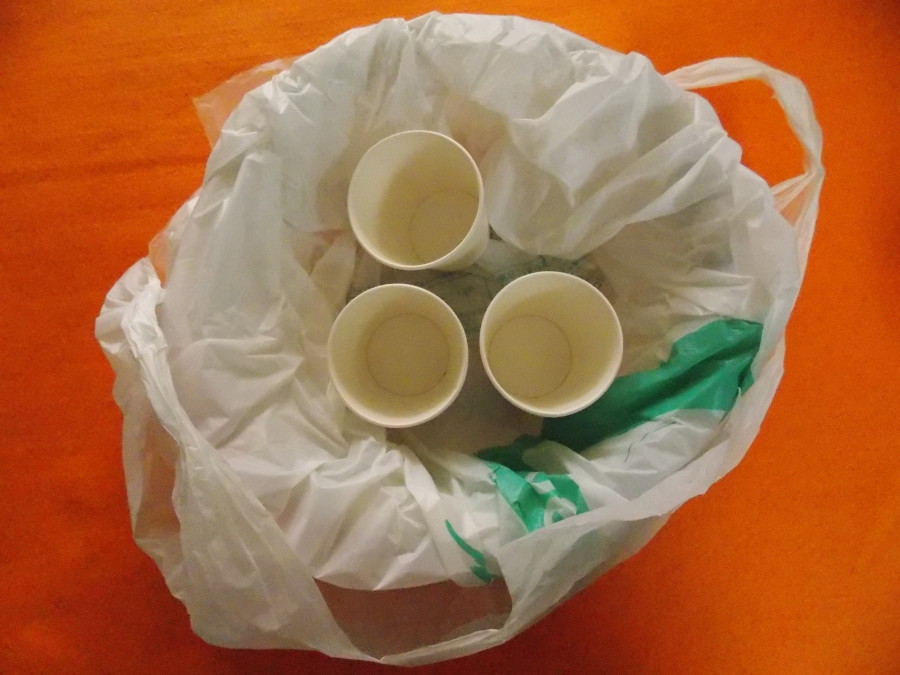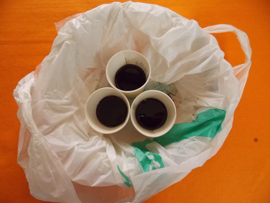 DSCN1174こぼれても大丈夫なように洗面器にゴミ袋を被せ紙コップを置きます。経験上、紙コップ3個位で処理出来るでしょう。