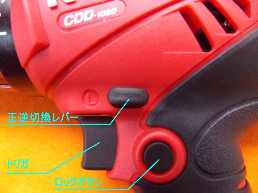 image11トリガを引くと入り、放すと切れます。トリガを引いた状態でロックボタンを押すと、トリガから指を放してもスイッチは入った状態になります。再度トリガを引くとロックボタンが解除され、トリガから指を放すとスイッチは切れます。正逆切換レバーで正回転、逆回転に切換わります。