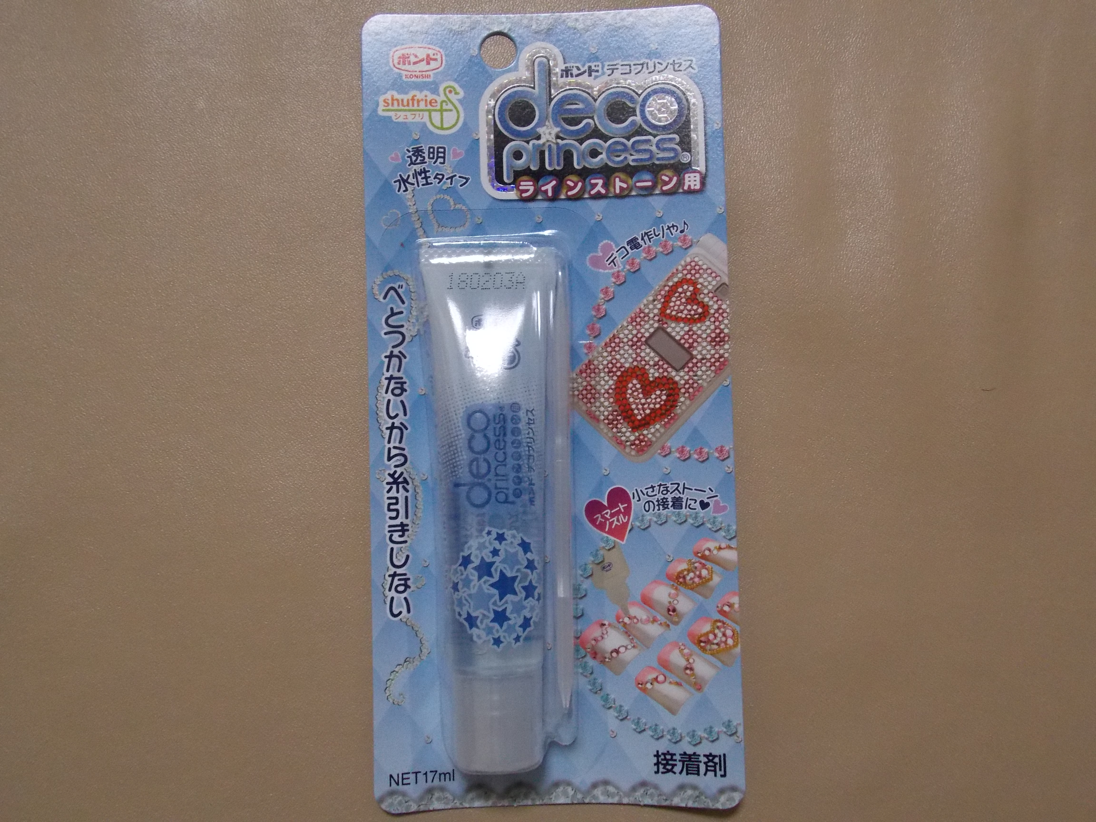 デコプリンセス 購入場所 アマゾン 使用目的 パーツの接着 種 類 水性形接着剤 成 分 シリル化ウレタン樹脂(36%)水(64%) 正味量 17ml 特徴 ※透明できれいに仕上がる ※水性タイプ ※べとつかないから糸引きしない ※スマートノズルで細かな作業もカンタン