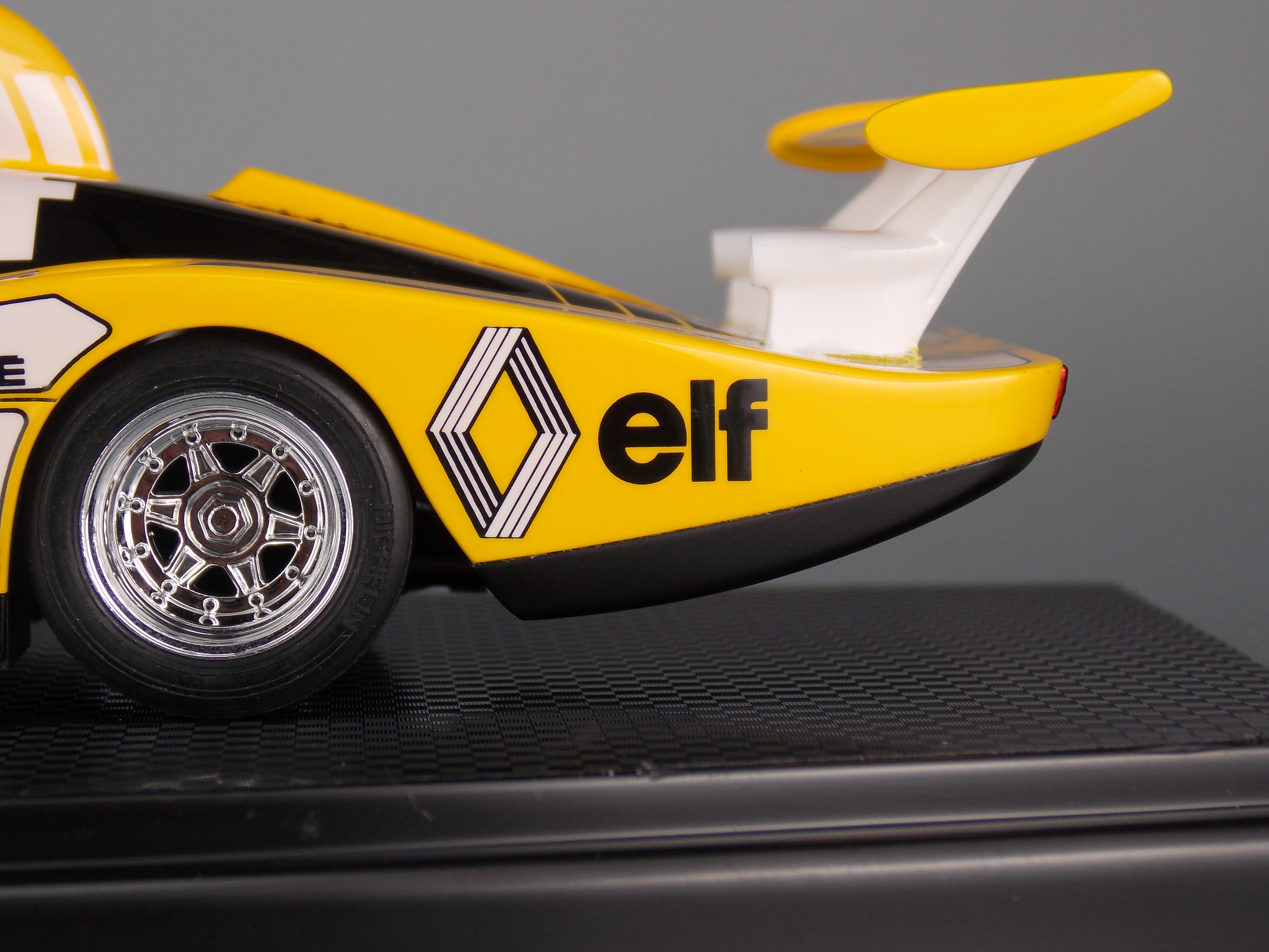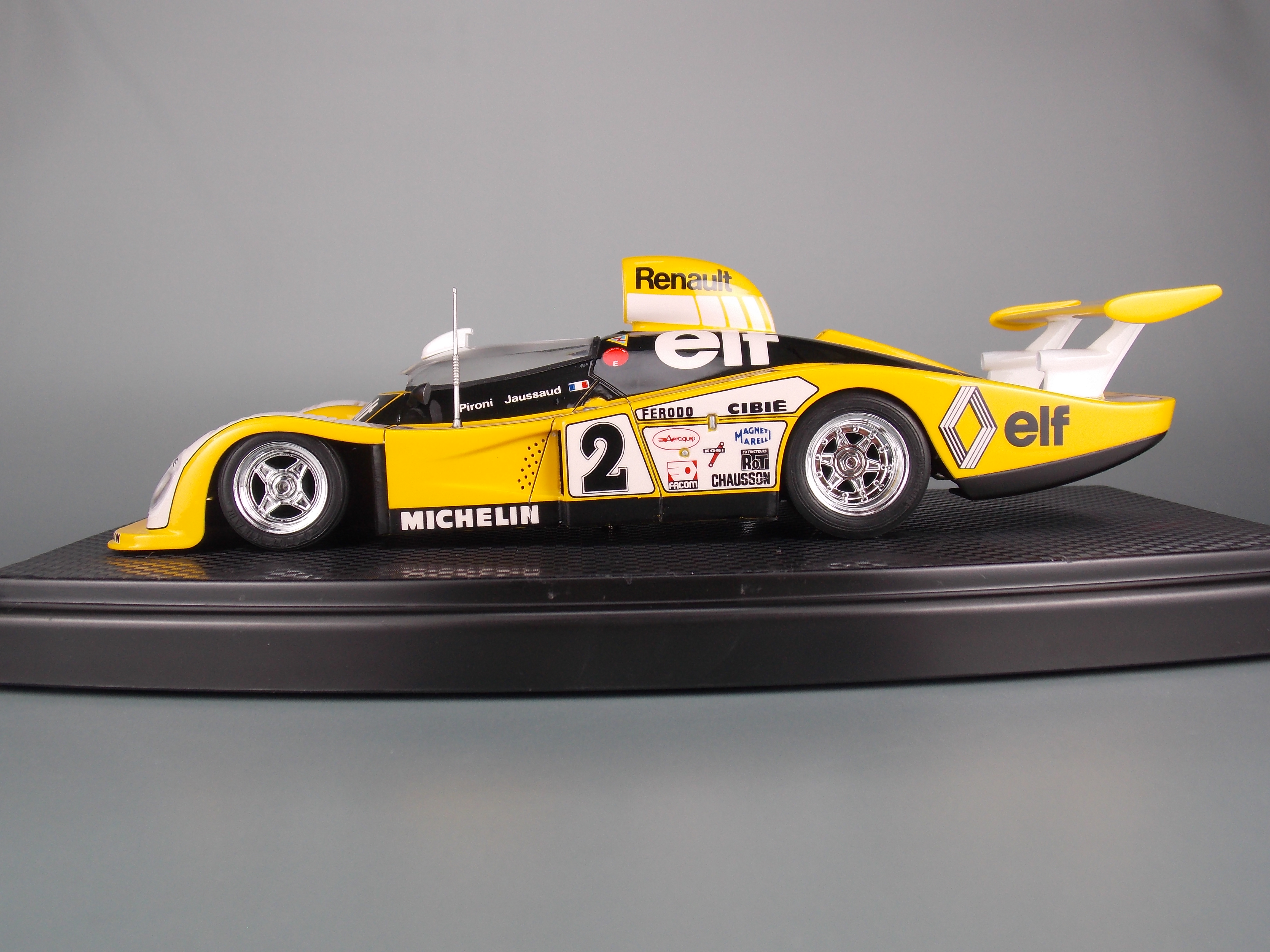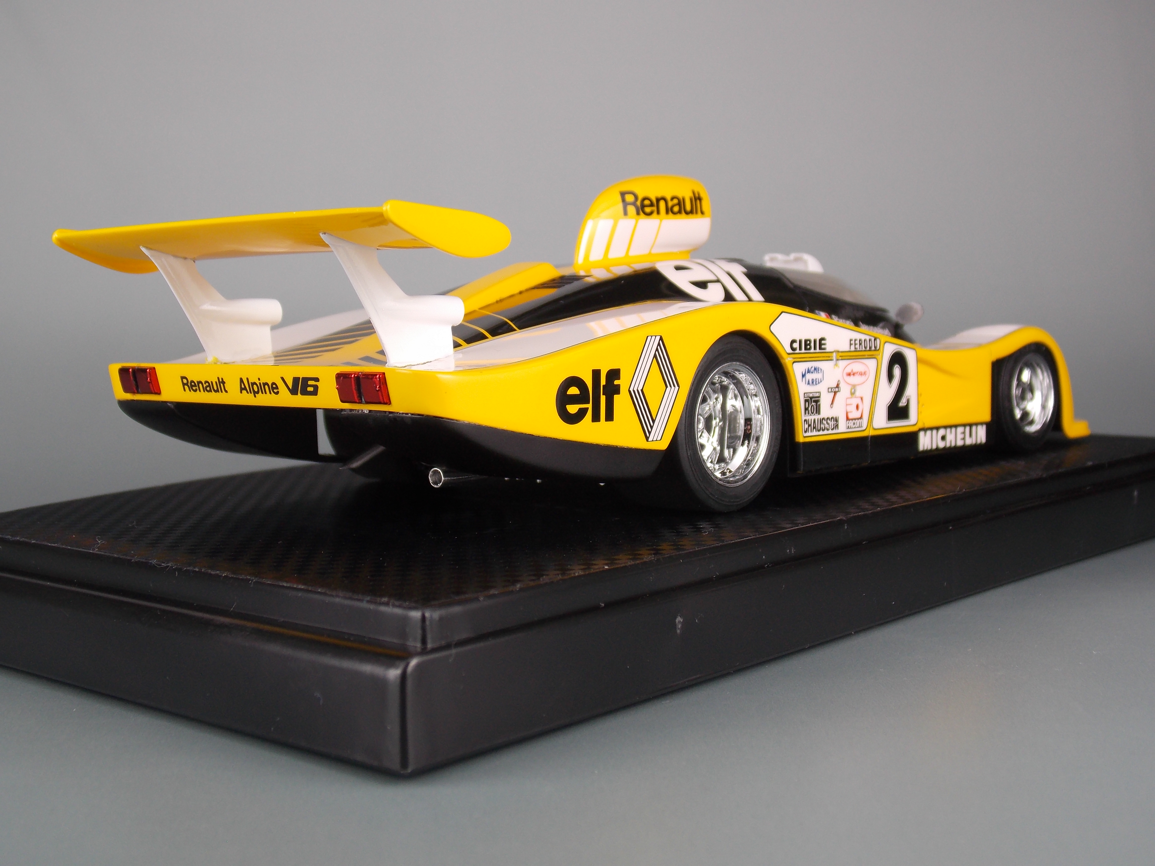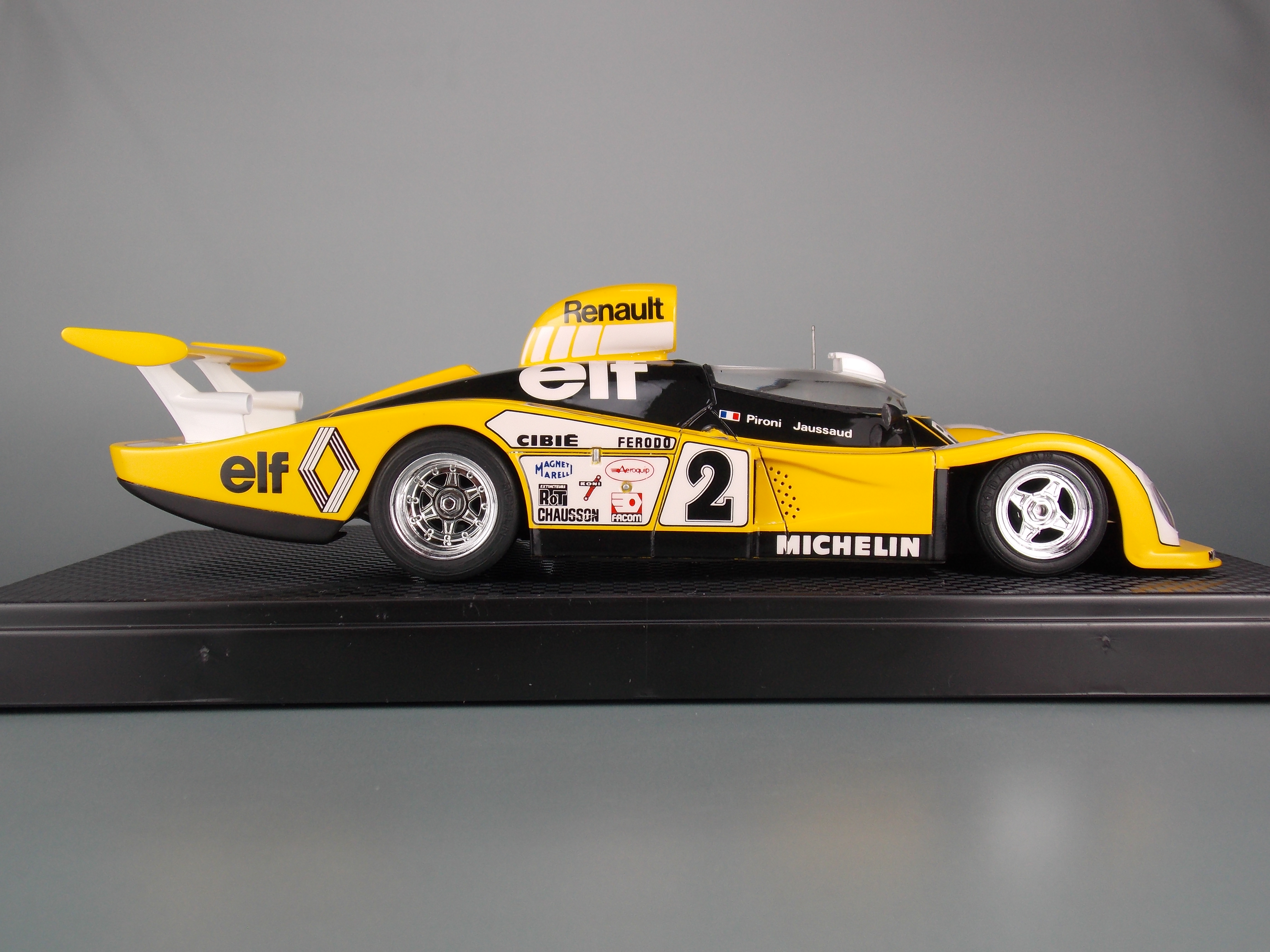 アルピーヌ・ルノーA442Bターボについて>1978年、挑戦3度目にして念願のル・マン制覇をはたしたオールフランス製レーシングカーがアルピーヌ・ルノーA442Bターボです。76年、77年に走ったA442の改良型で、シャーシはパイプを組合わせたスペースフレーム構造を採用。流れるようなロングテールボディは全体的に丸味をおび、コクピットに取りつけられた半透明のカバーが大きな特徴となっています。エンジンはルノーV型6気筒DOHC1997ccで、ターボチャージャー1基を装備。最高速度は時速約350キロを記録しました。フランス人のディディエ・ピローニとジャン・ピエール・ジャッソーのドライブで、4年ぶりにル・マンの栄光を地元フランスに持ち帰ったのです。