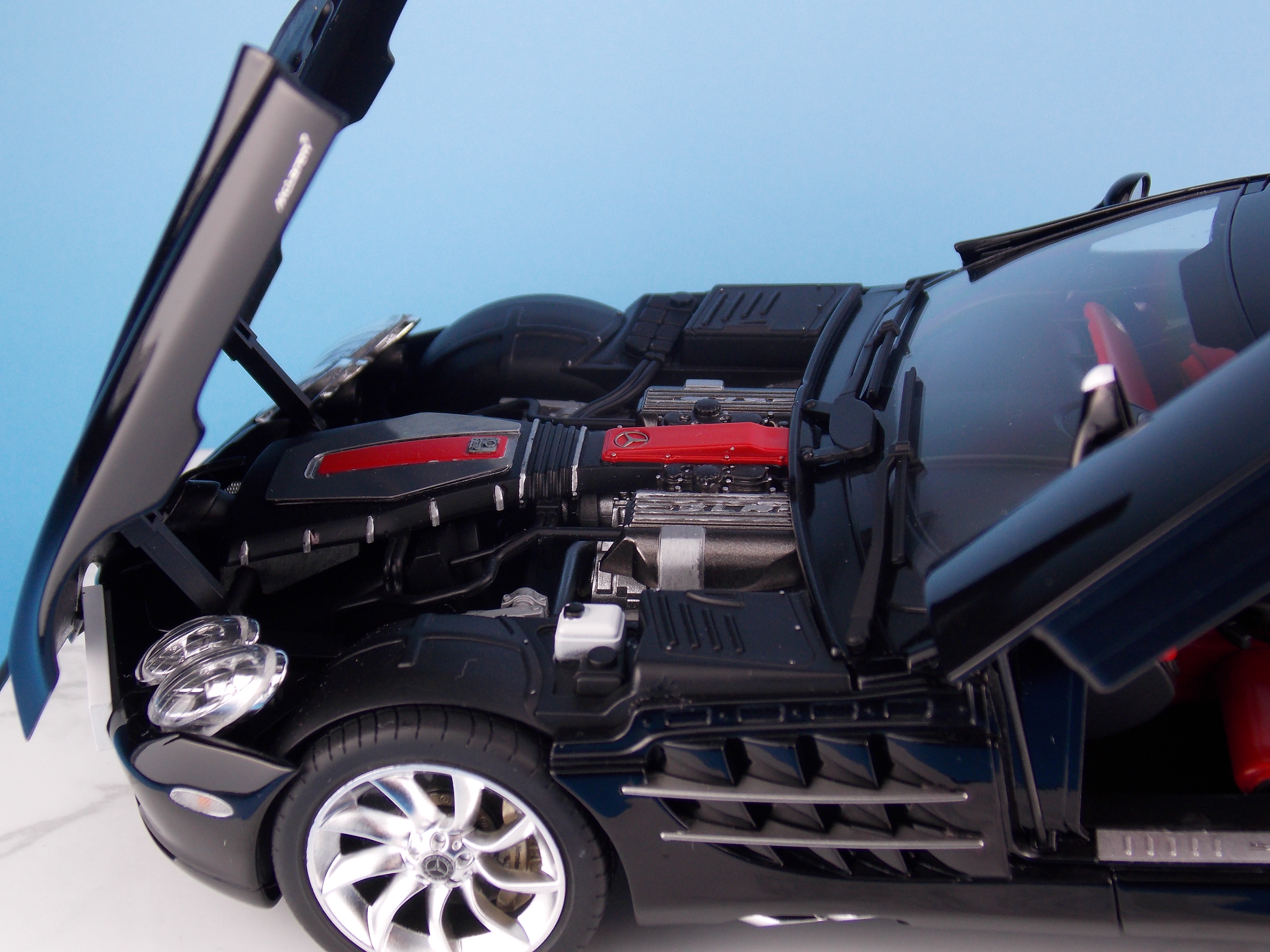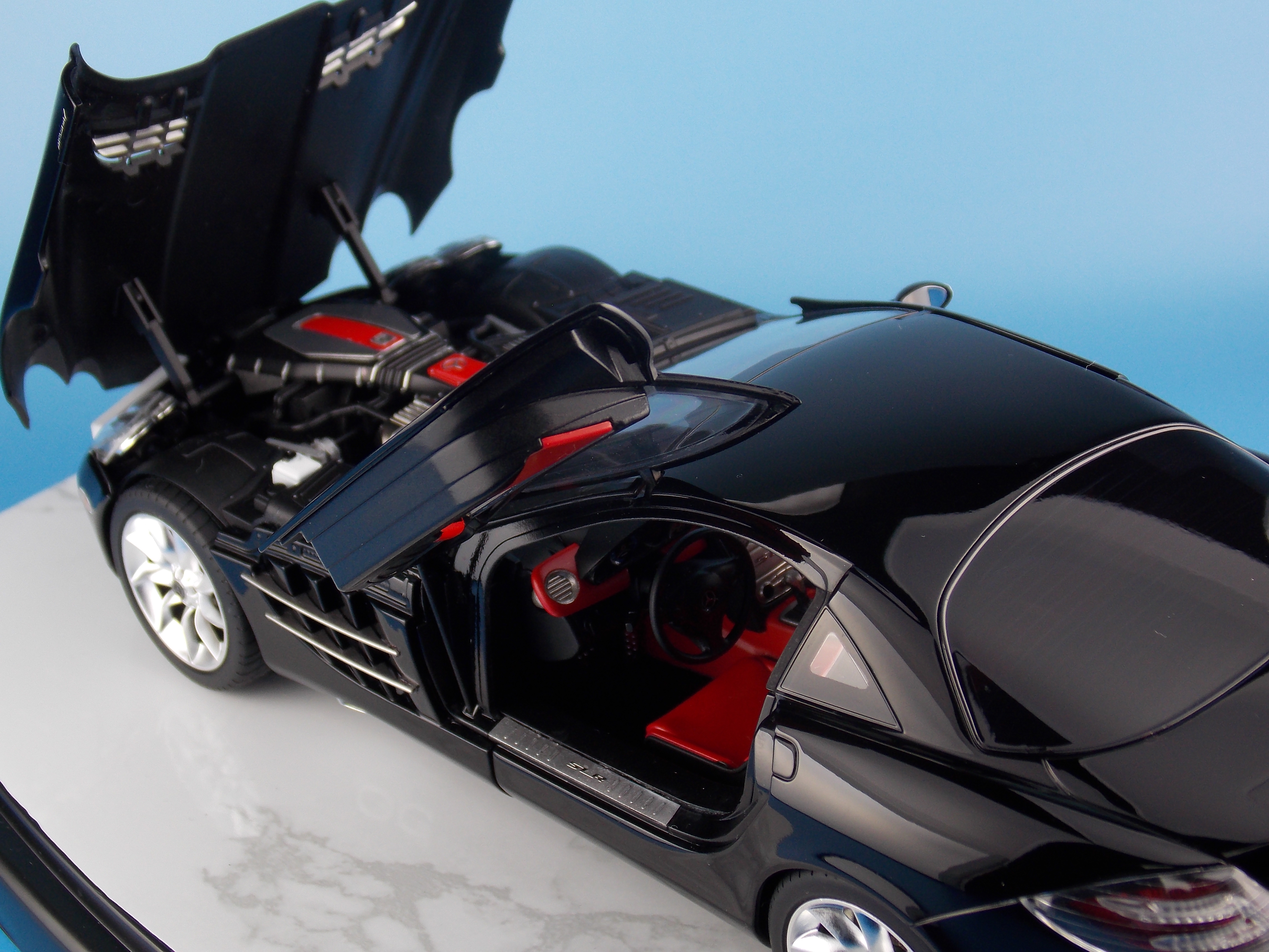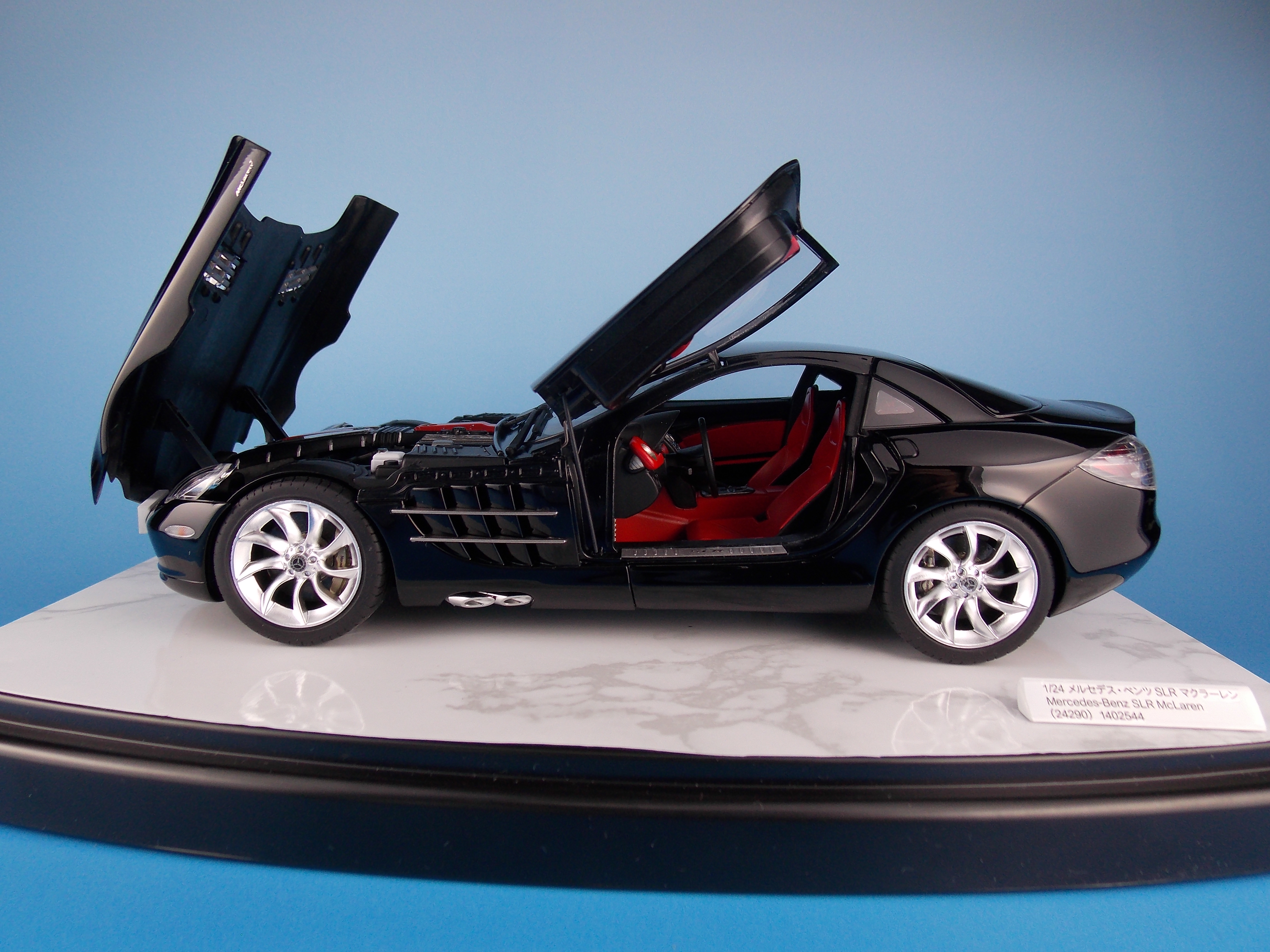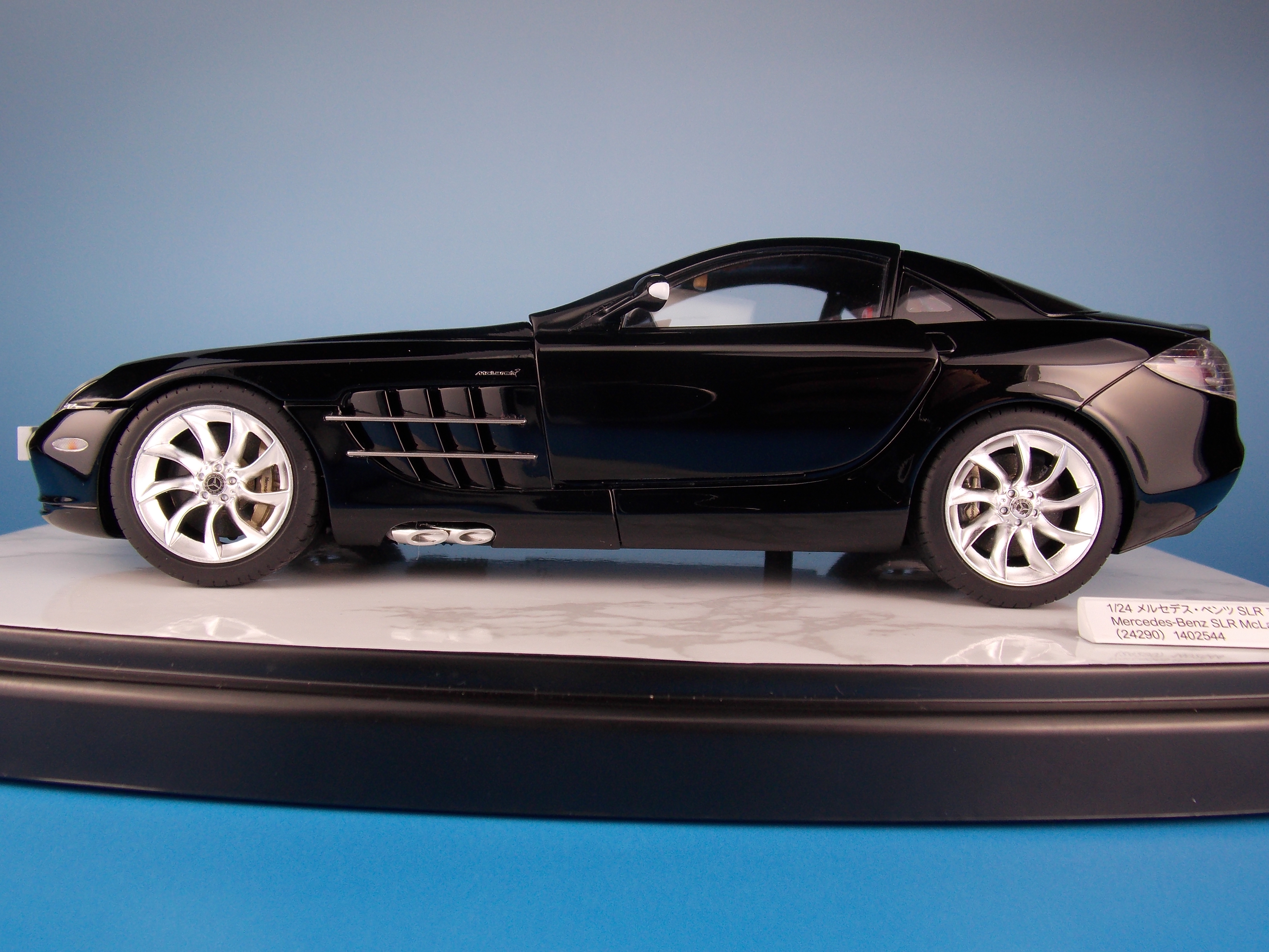 <模型要目>★メルセデス・ベンツのプレミアムスポーツカー、SLR マクラーレンのプラスチックモデル組み立てキットです。★スケール1/24、全長195mm、全幅81mm。★ロングノーズ・ショットデッキの個性的なフォルムをリアルに再現。★スイングウイングドアと呼ばれる左右ドアは金属製クランクシャフトを使用して実車同様に開閉可能。★ボンネットも開閉でき、完成後もV8エンジンを観察できます。★フェンダーやトランク、サイドシルのエンブレムやロゴにインレットマークを使用。★つやあり、つや消しメッキパーツで質感を演出。★テールレンズはクリヤーレッド部品。★アンダーパネルはダイキャスト製。