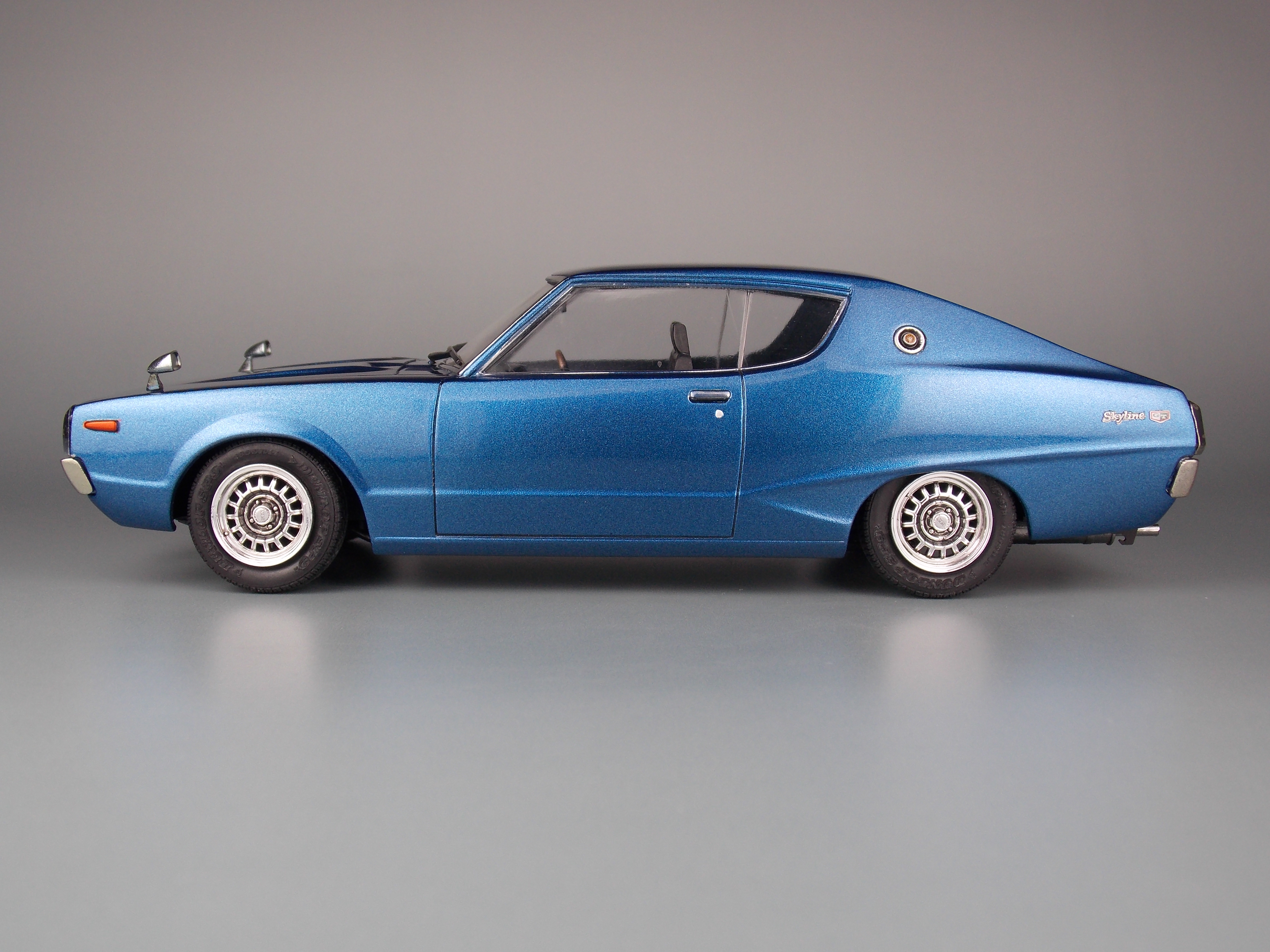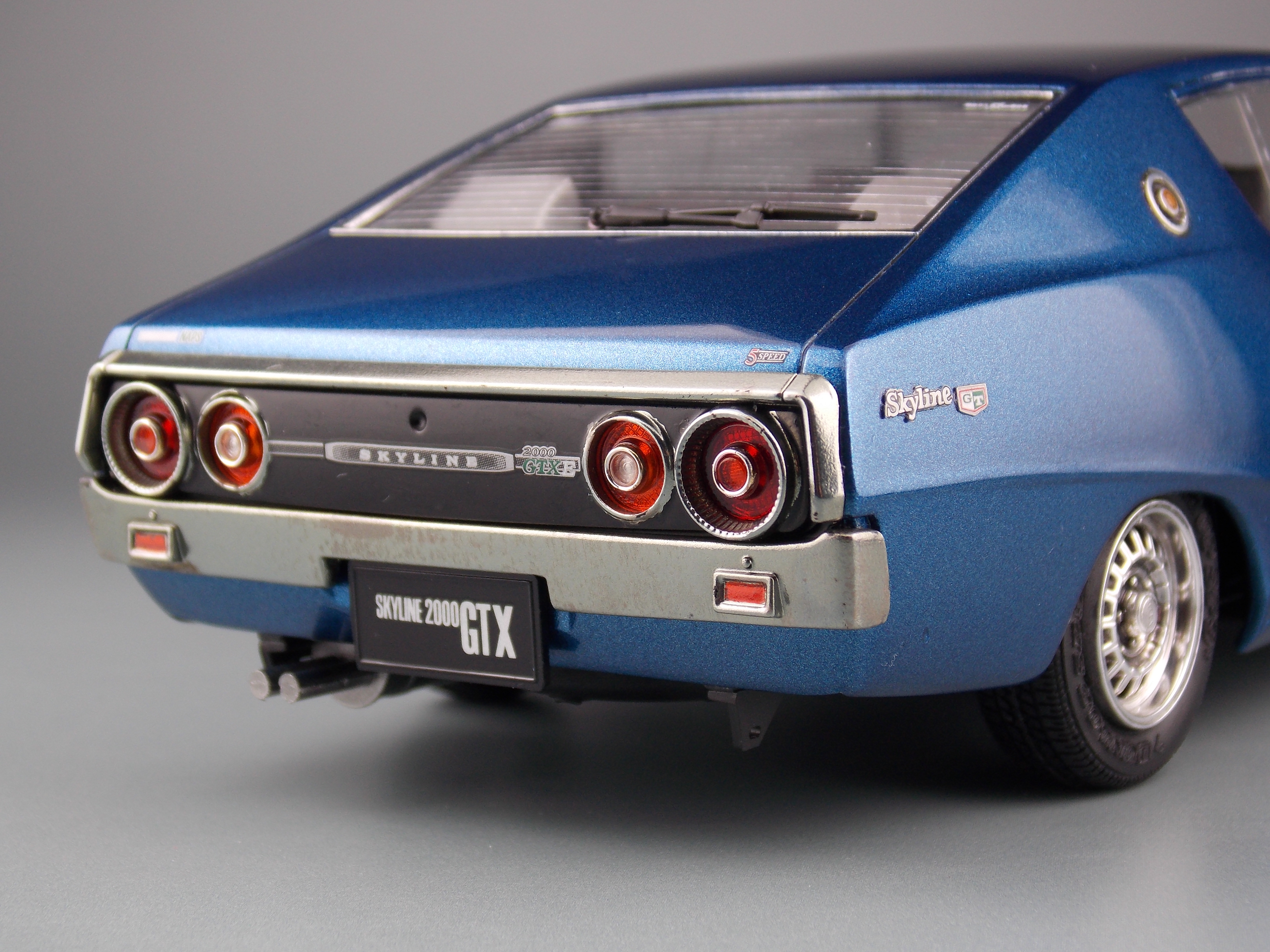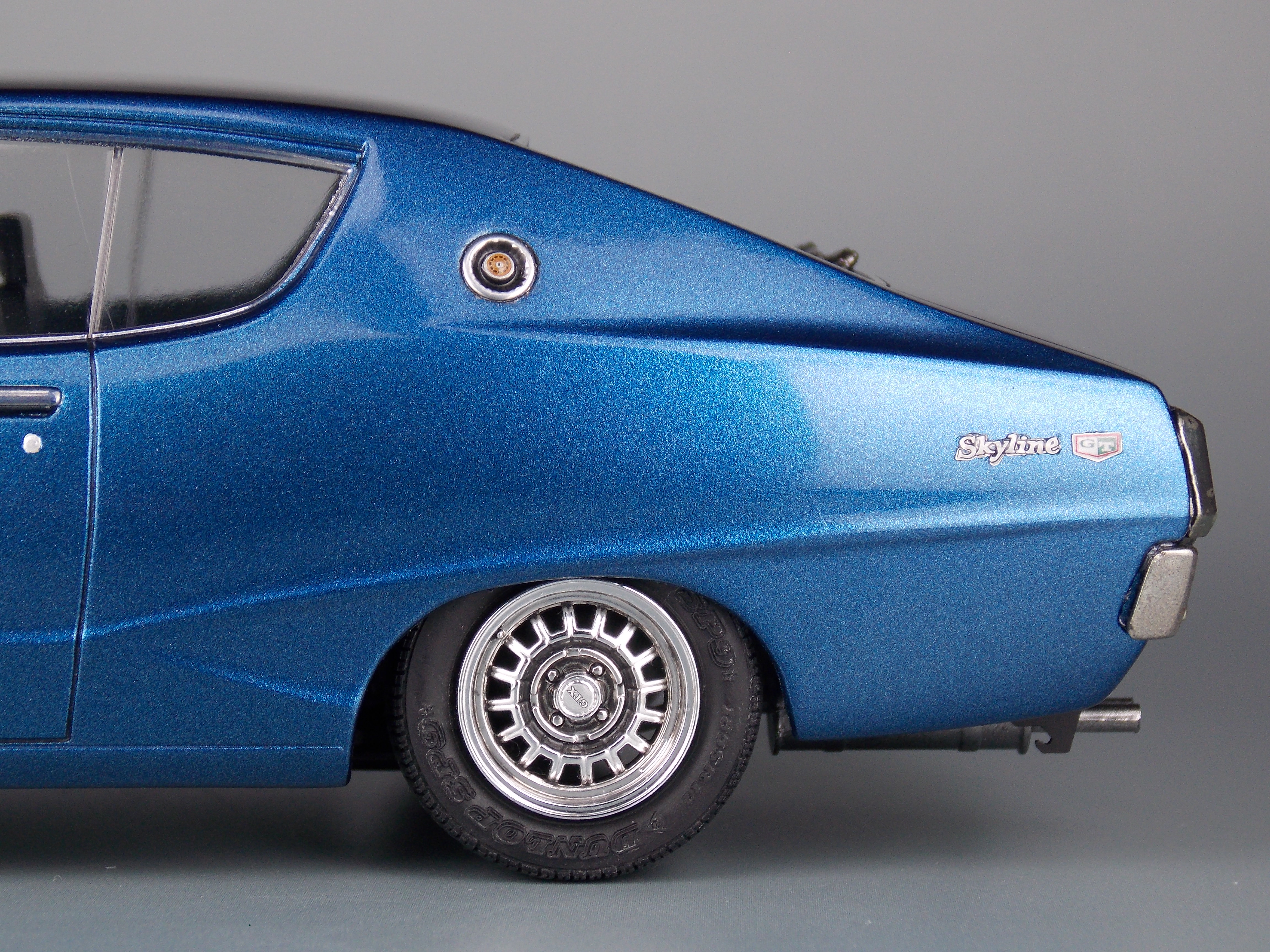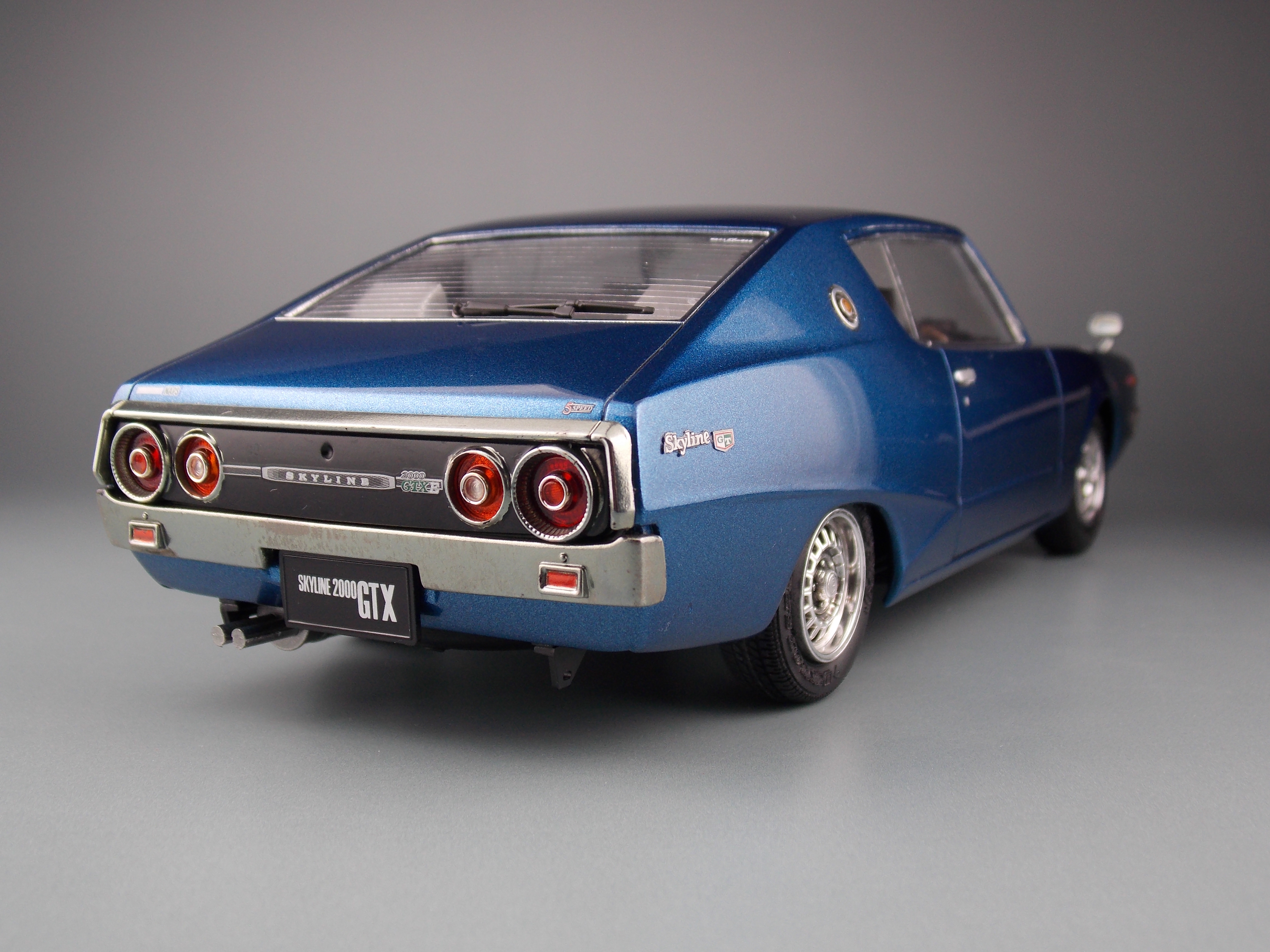 このキットは、ケンメリ2000GTX-E・Sの組立式プラモデルで、カタログ仕様を再現しています。昭和50年代に開発された金型を使用している為、現代の最新キットとは考証や再現度、理念が異なる部分もありますあが、フロントグリルとリアテールパネル、純正アルミホイールやリアワイパーを2017年のクオリティで部品追加し、完成度を高めています。更に車高選択可能なシャーシやカスタムパーツ、アルミホイール等も入り、より自分好みのケンメリを作る事が出来ます。
