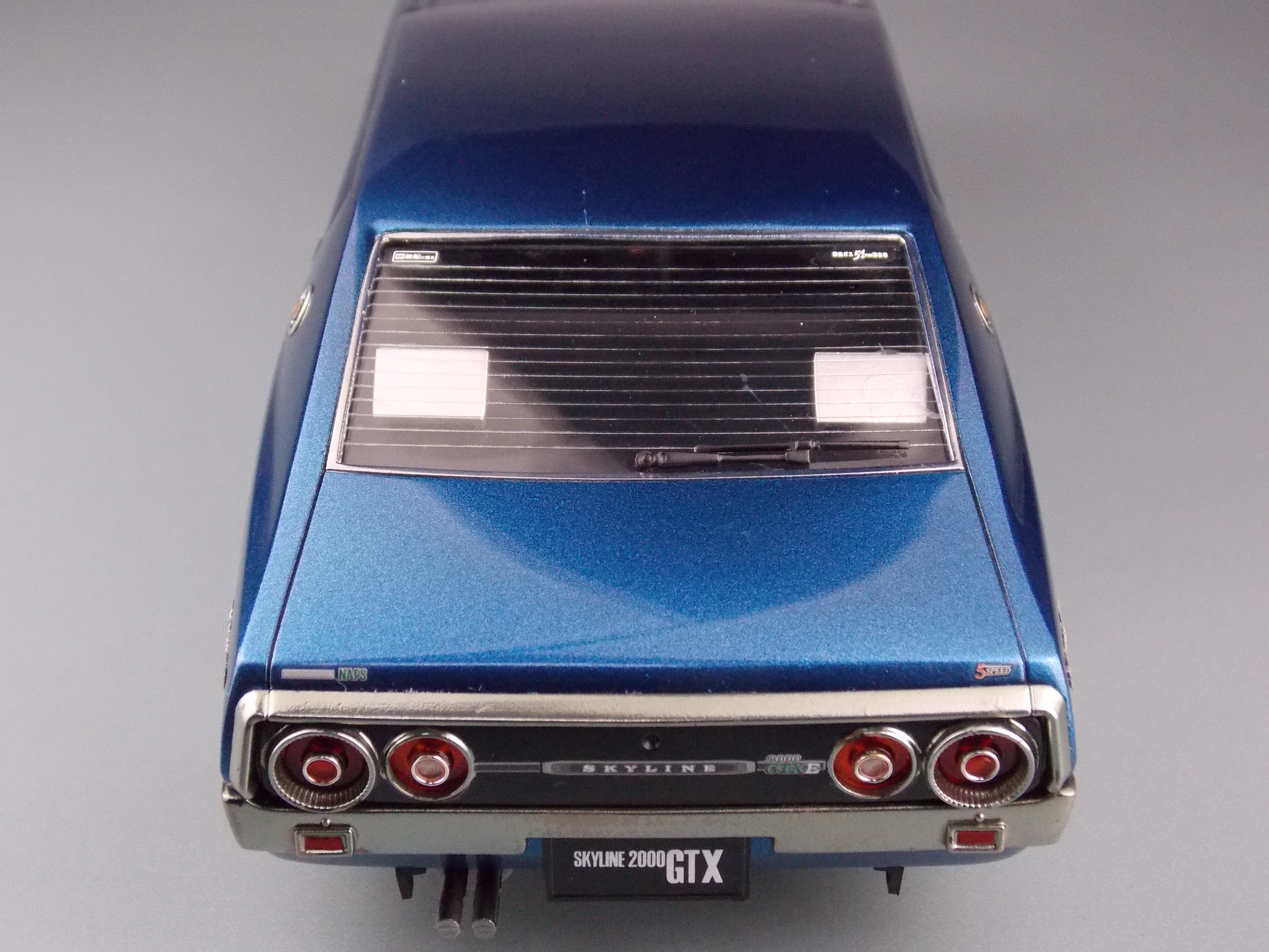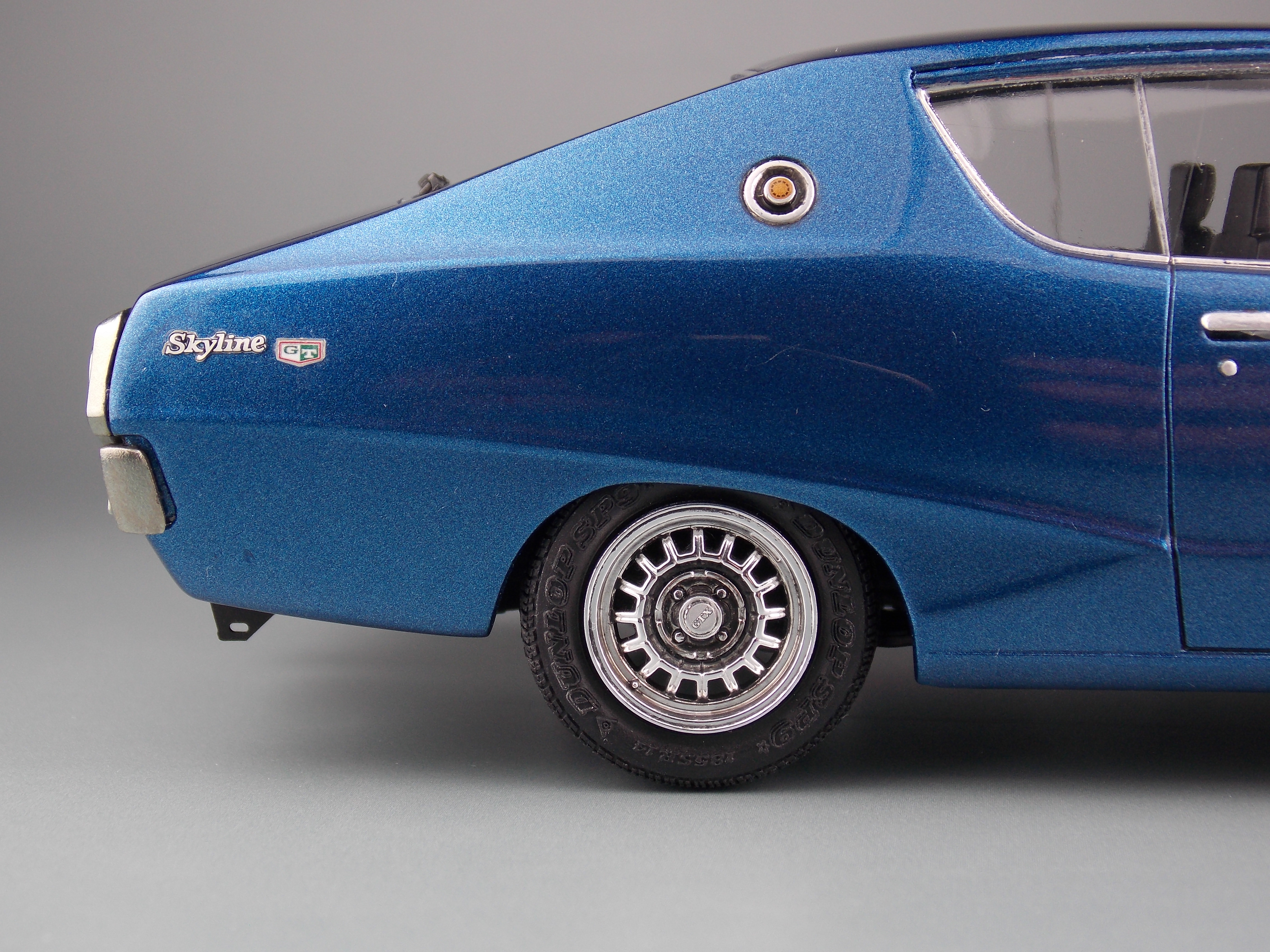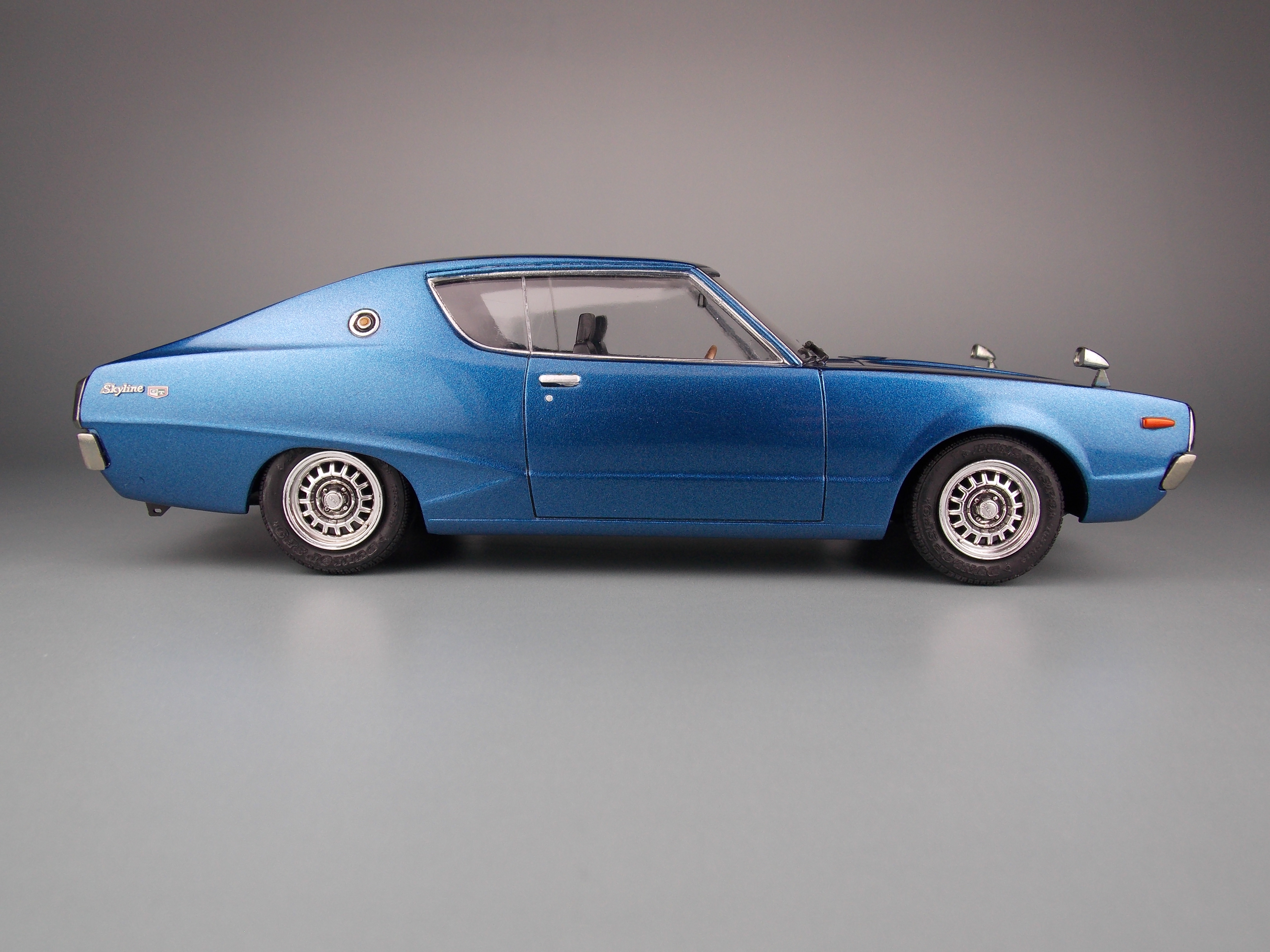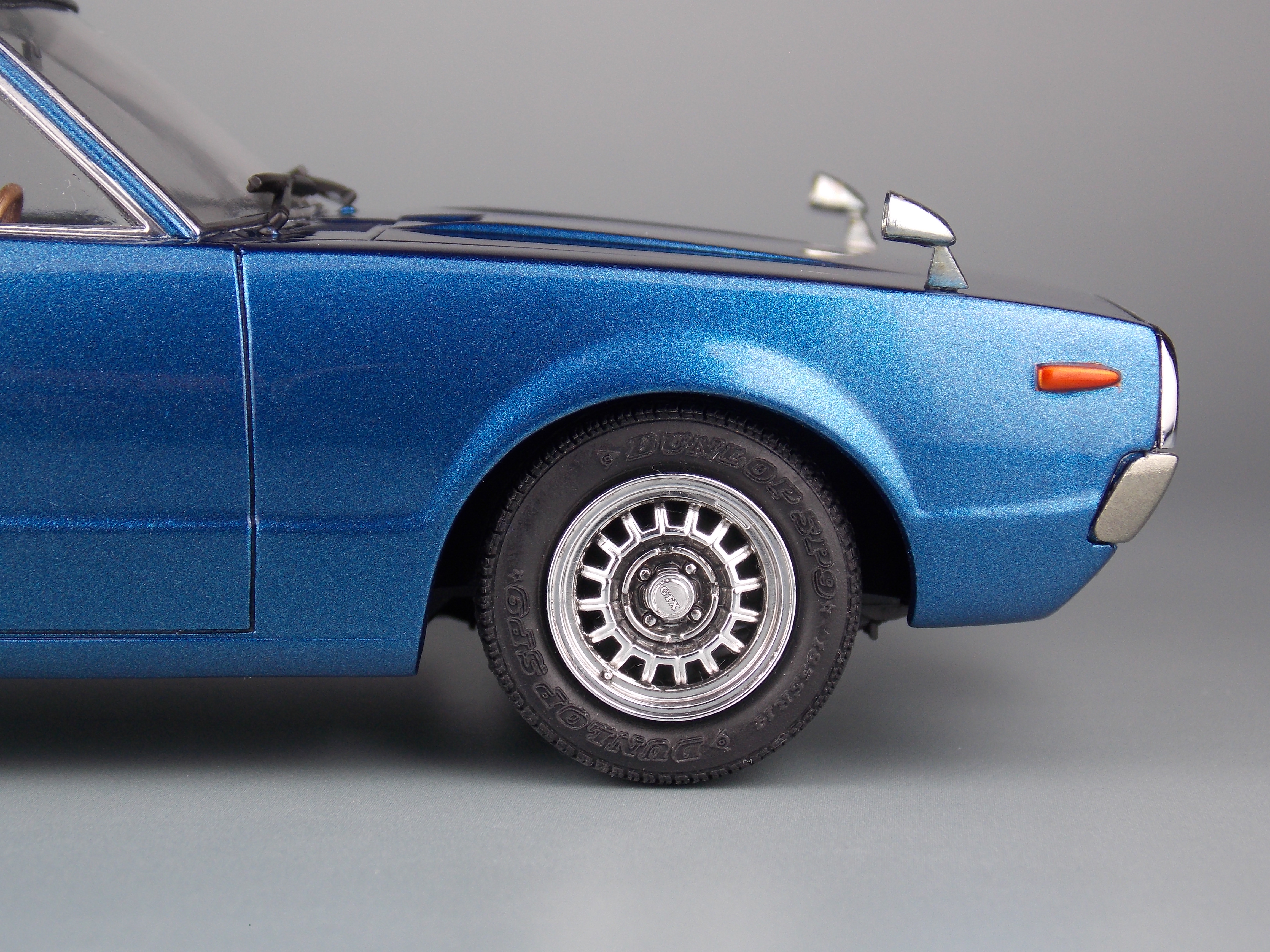 このキットは、ケンメリ2000GTX-E・Sの組立式プラモデルで、カタログ仕様を再現しています。昭和50年代に開発された金型を使用している為、現代の最新キットとは考証や再現度、理念が異なる部分もありますあが、フロントグリルとリアテールパネル、純正アルミホイールやリアワイパーを2017年のクオリティで部品追加し、完成度を高めています。更に車高選択可能なシャーシやカスタムパーツ、アルミホイール等も入り、より自分好みのケンメリを作る事が出来ます。