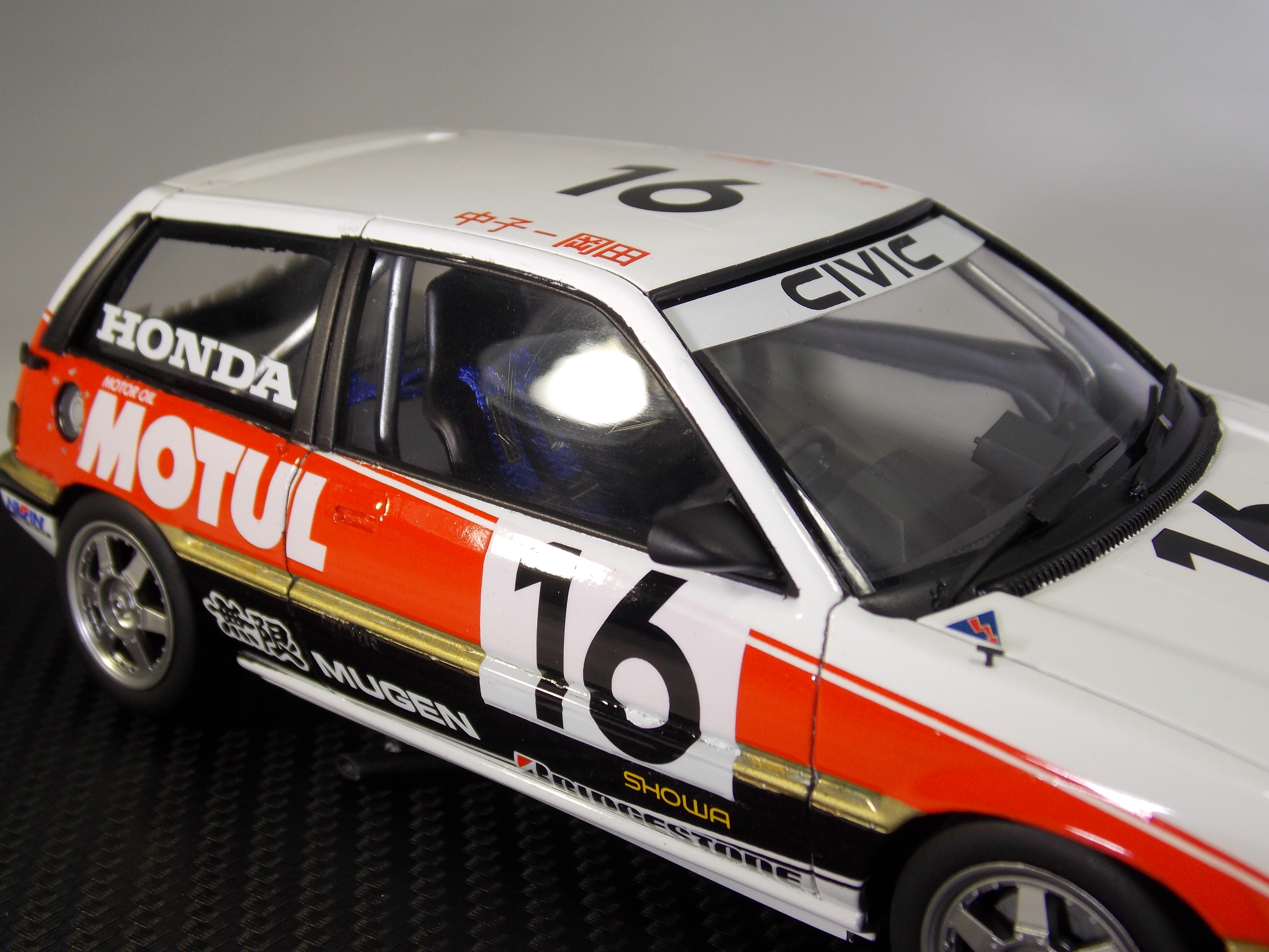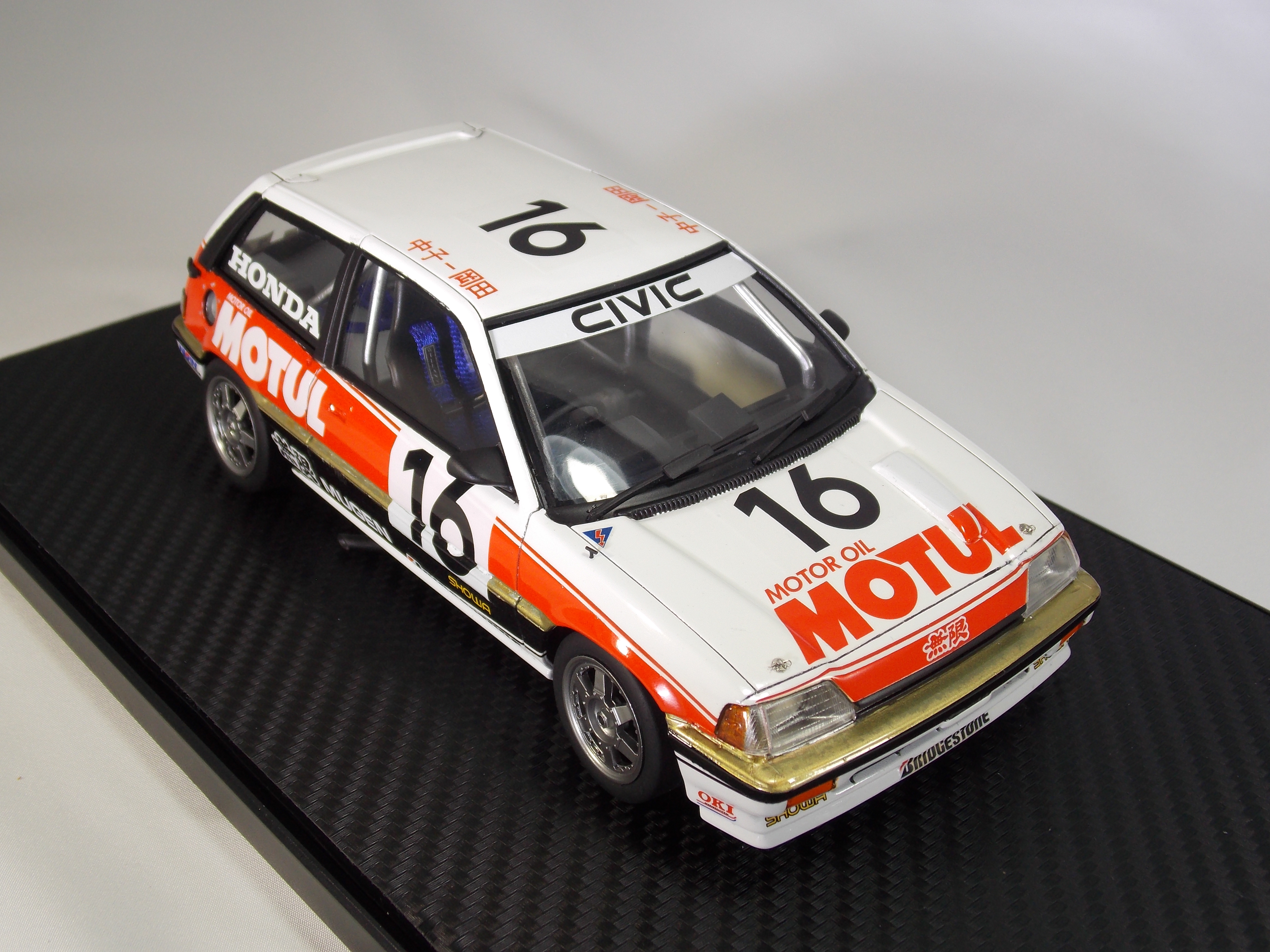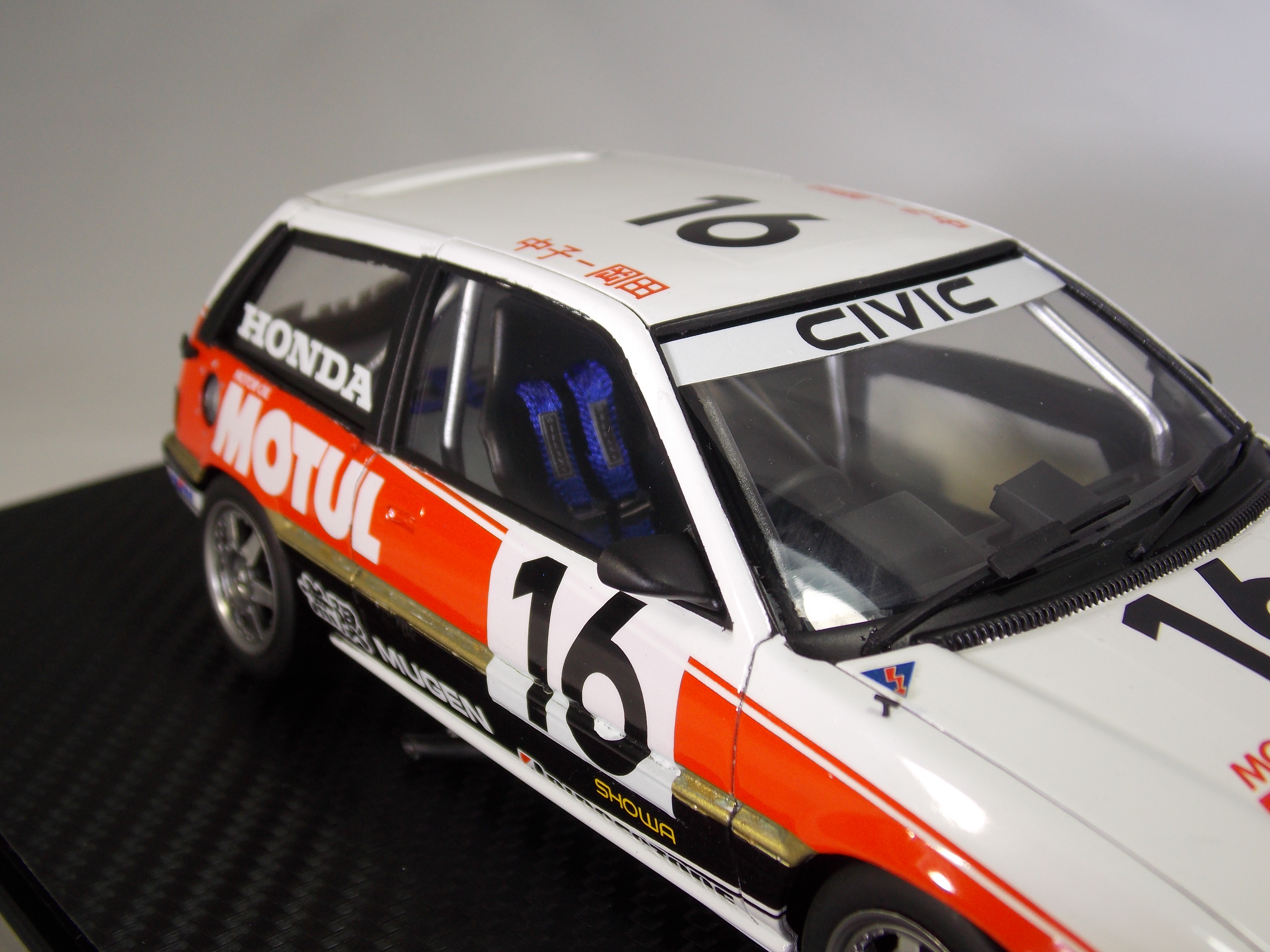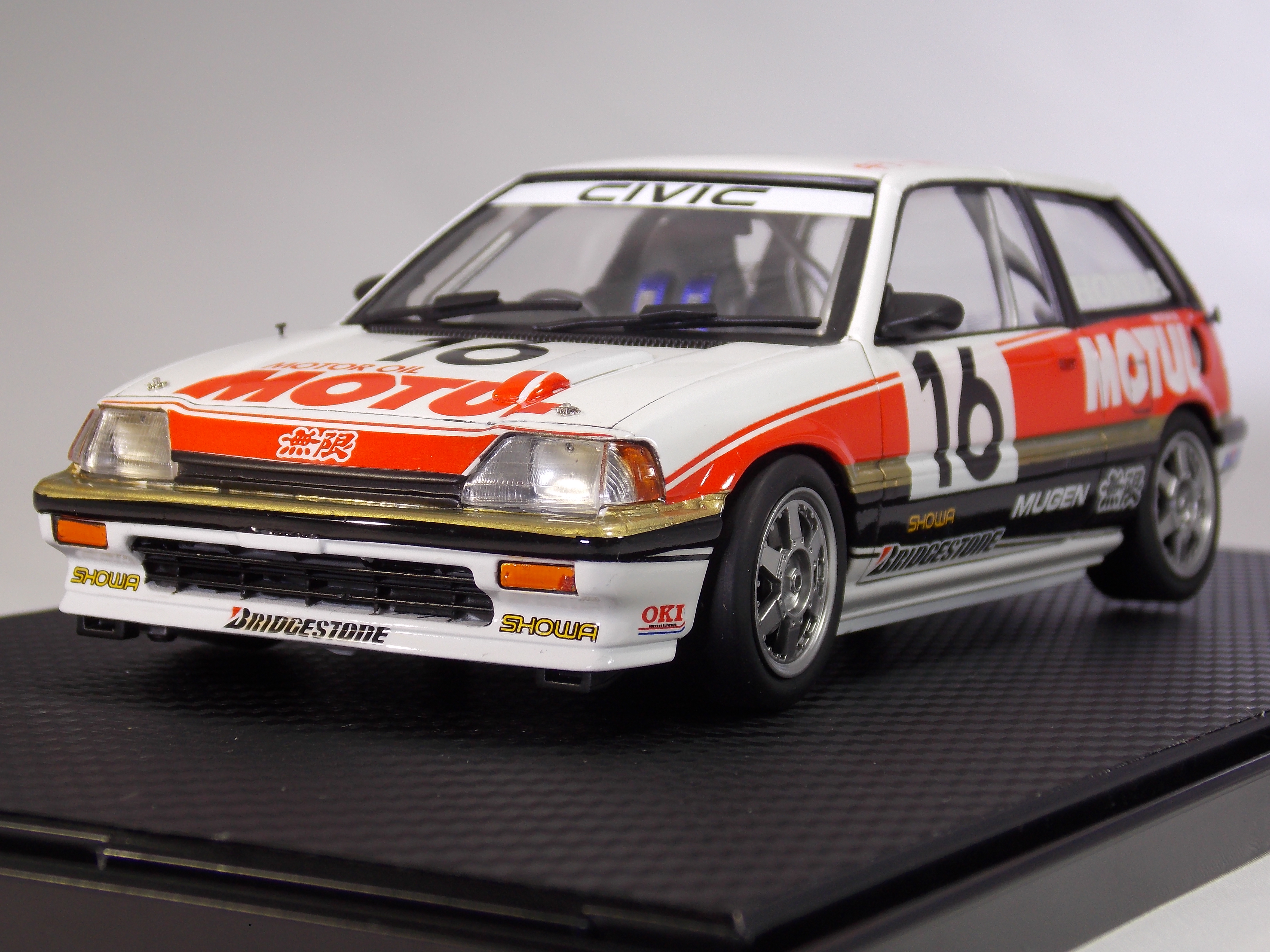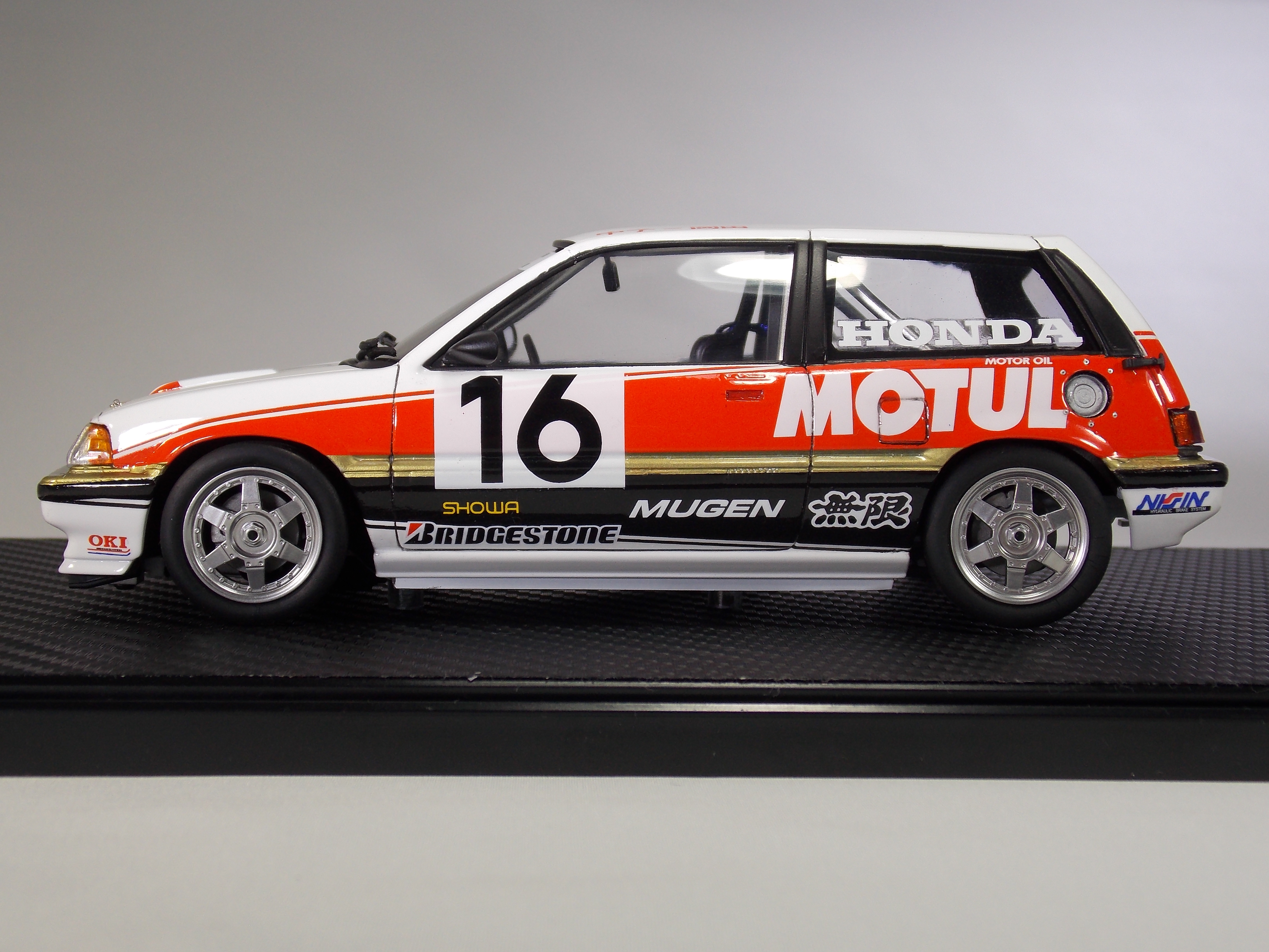 <模型要目>★1986年の全日本ツーリングカー選手権で活躍を見せたHonda無限シビックSi Gr.Aレーシングを1/24スケールで再現したプラスチックモデル組み立てキットです。全長158mm、全幅75mm。★全体的なフォルムは市販車と同じながら、ブレーキ冷却用エアダクトやエアジャッキ、両サイドの燃料給油口、サイド出しの排気管などを装備したレーシーな姿をモデル化。★助手席と後部座席を取り払いロールゲージを張り巡らした室内は、フルバケットシートや消火器などもパーツ化。ダッシュボードには補助メーターや燃料計まで再現しました。★カラフルなカラーリングはスライドマークでセット。★無限オリジナルホイールはメッキパーツ。★レーシングスリックタイヤは質感あるソリッドゴム製で、フロントタイヤはステアリングできます。