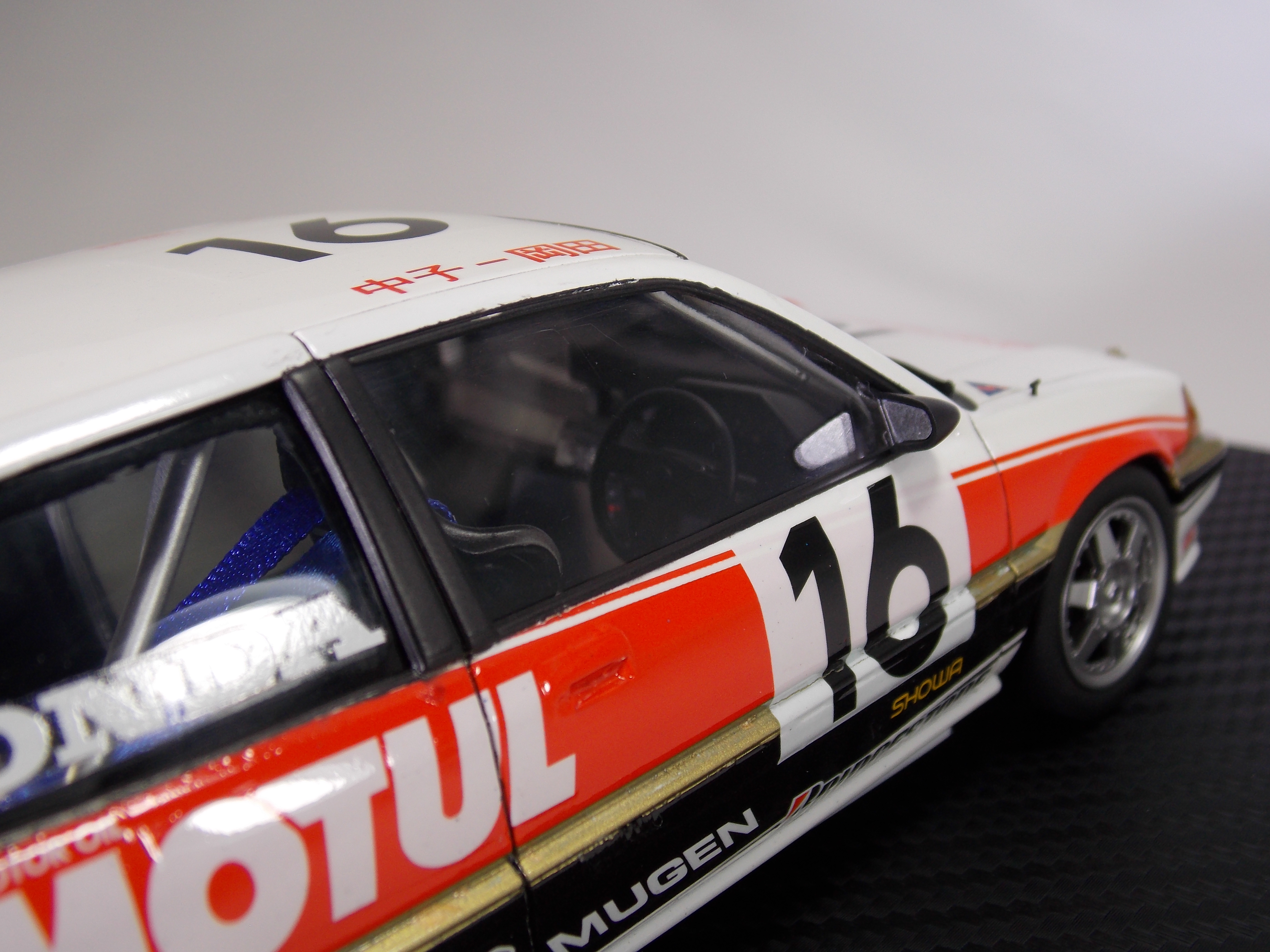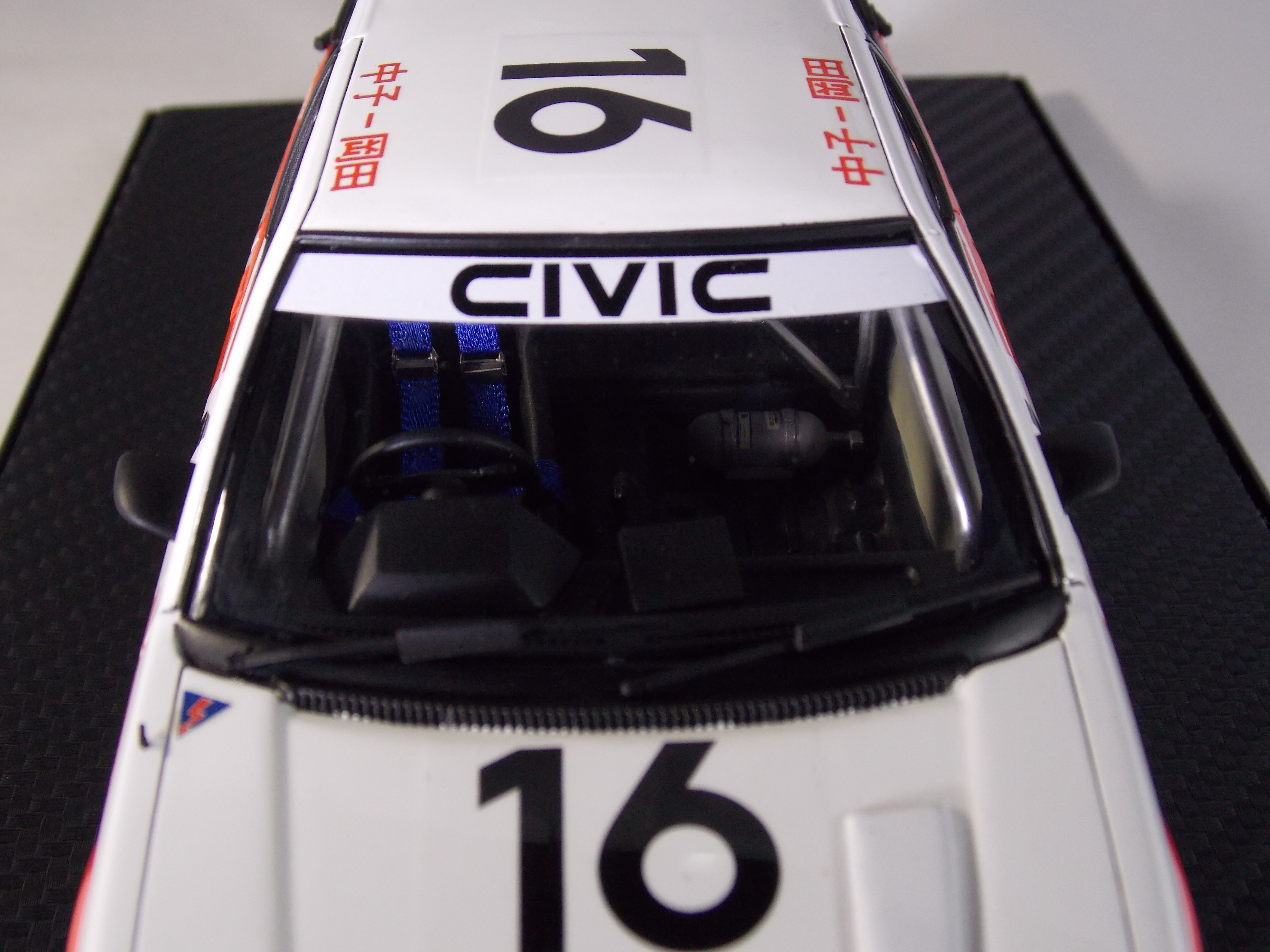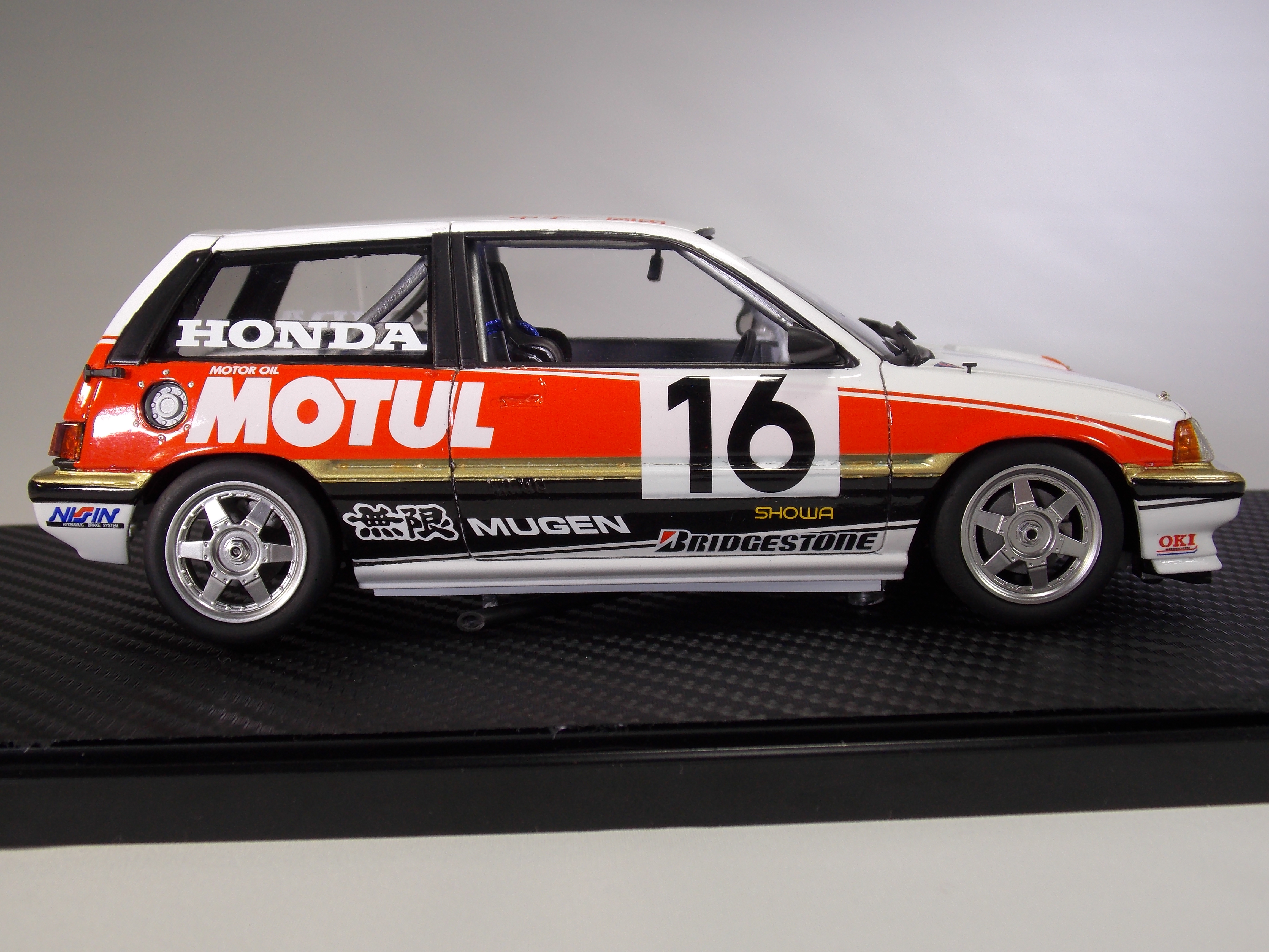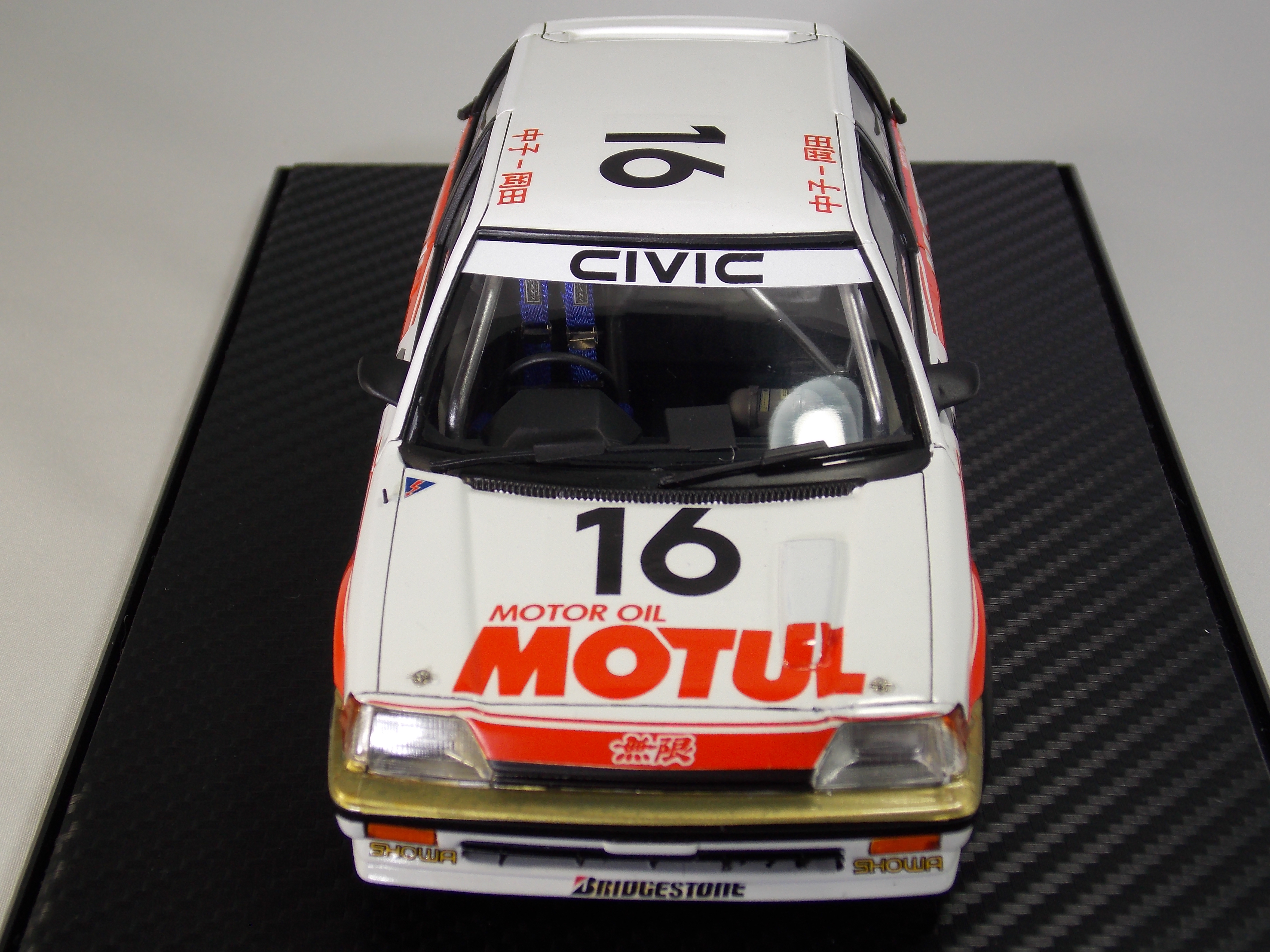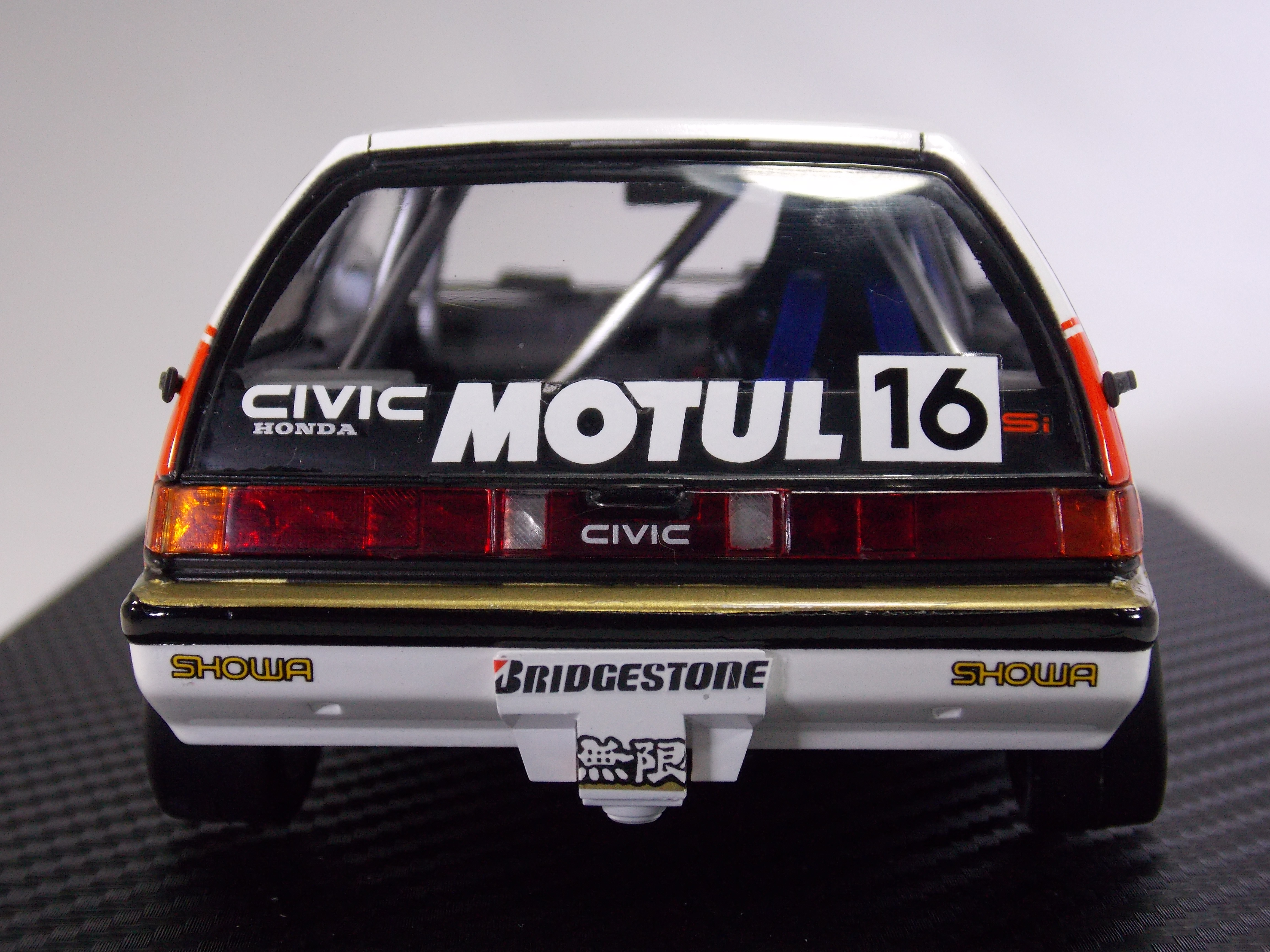 <模型要目>★1986年の全日本ツーリングカー選手権で活躍を見せたHonda無限シビックSi Gr.Aレーシングを1/24スケールで再現したプラスチックモデル組み立てキットです。全長158mm、全幅75mm。★全体的なフォルムは市販車と同じながら、ブレーキ冷却用エアダクトやエアジャッキ、両サイドの燃料給油口、サイド出しの排気管などを装備したレーシーな姿をモデル化。★助手席と後部座席を取り払いロールゲージを張り巡らした室内は、フルバケットシートや消火器などもパーツ化。ダッシュボードには補助メーターや燃料計まで再現しました。★カラフルなカラーリングはスライドマークでセット。★無限オリジナルホイールはメッキパーツ。★レーシングスリックタイヤは質感あるソリッドゴム製で、フロントタイヤはステアリングできます。